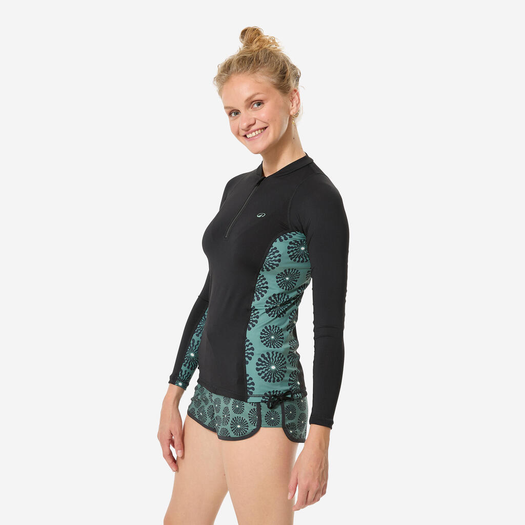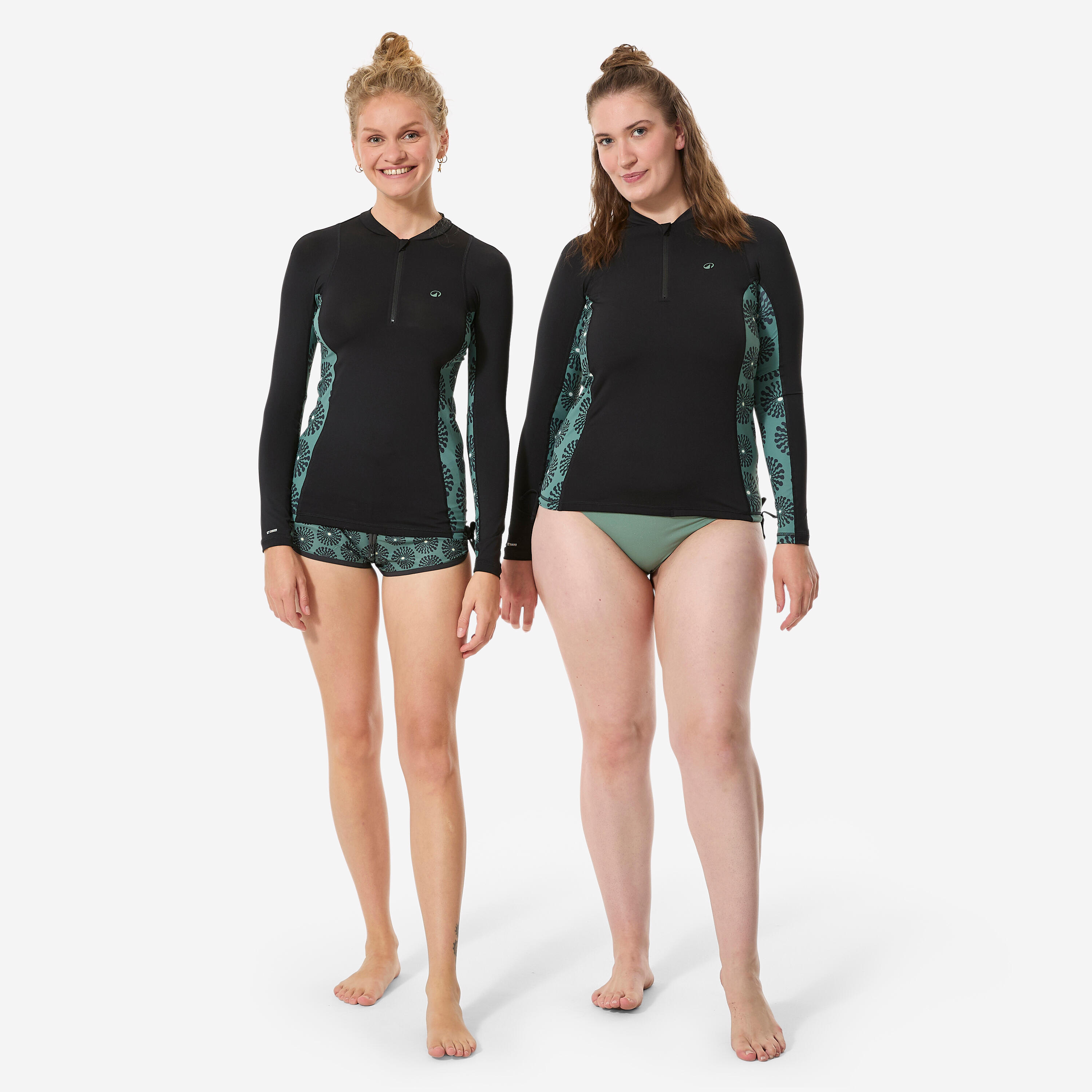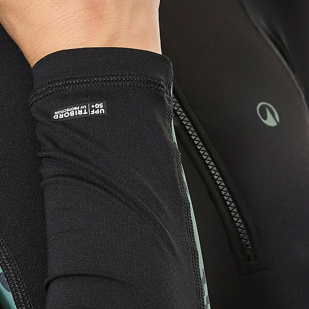 Το ύφασμα αυτού του προϊόντος OLAIAN με προστασία από ακτίνες UV φιλτράρει τουλάχιστον το 98% της ακτινοβολίας UVB και το 95% της ακτινοβολίας UVA (UPF 50+). Έτσι, εγγυάται αποτελεσματική προστασία από τον ήλιο. Μπορεί να χρησιμοποιηθεί μέσα και έξω από το νερό, για όλα τα θαλάσσια σπορ. Η πυκνότητα των ινών του υφάσματος φιλτράρει ακτίνες UV για προστασία μακράς διάρκειας ακόμα και μετά το πλύσιμο. Προειδοποίηση: η ελαστάνη στις ίνες μπορεί να φθαρεί σε νερό με χλώριο.