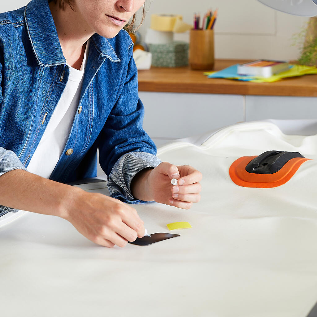 Κιτ επιδιόρθωσης για φουσκωτό SUP με κόλλα, φύλλα που μπορείτε να κόψετε και μια σπάτουλα για τέλεια προσαρμογή.