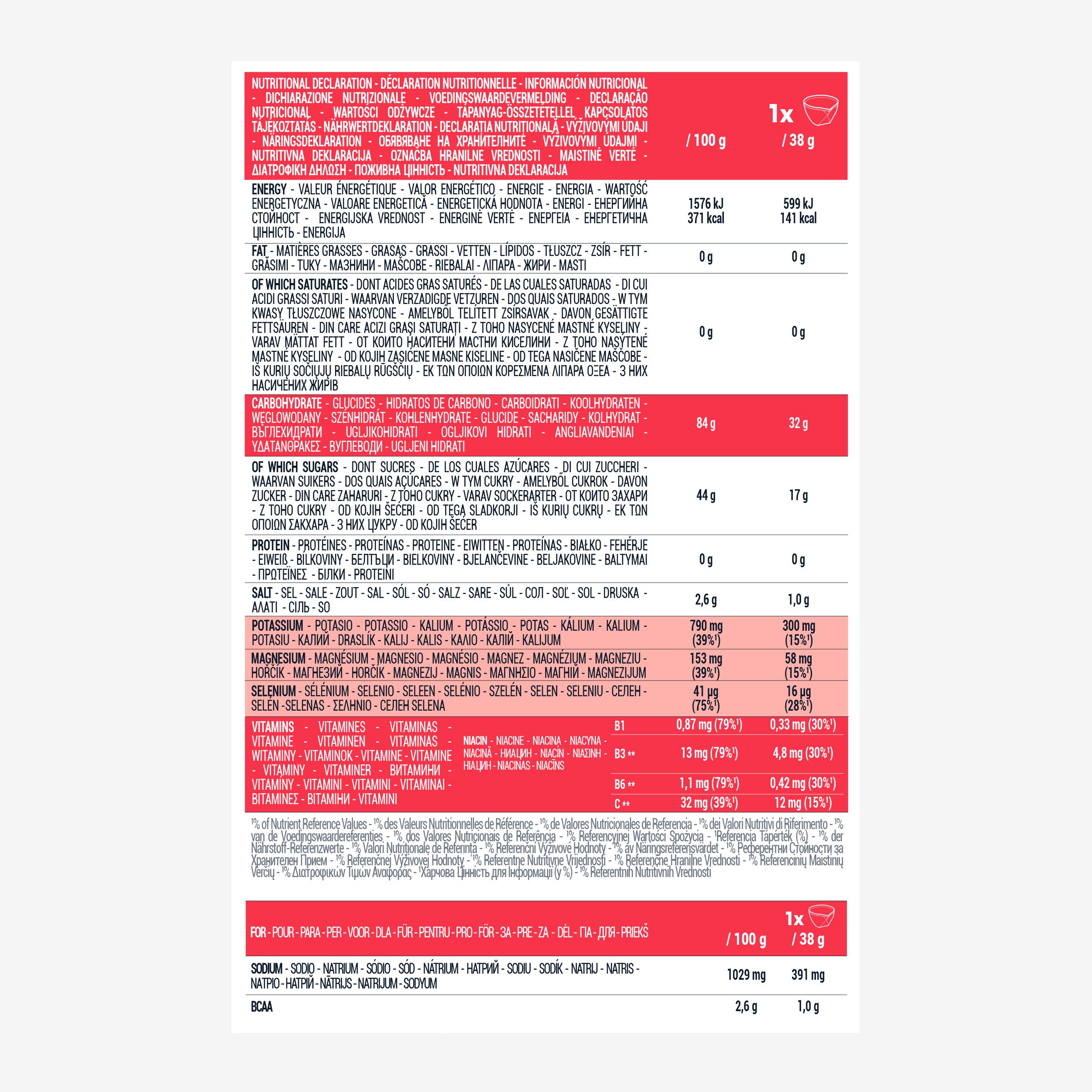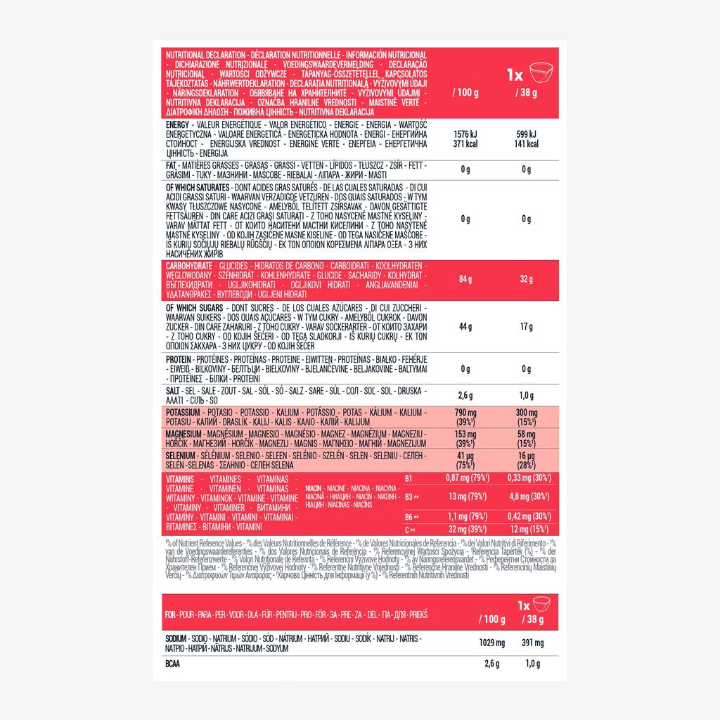 Συστατικά: Μαλτοδεξτρίνη (44%), σακχαρόζη (29%), φρουκτόζη (12%), ρυθμιστής οξύτητας: κιτρικό οξύ, κιτρικό νάτριο, BCAA (2,6%): L-λευκίνη, L-ισολευκίνη, L-βαλίνη, κιτρικό κάλιο, φυσικό άρωμα, χλωριούχο νάτριο, κιτρικό μαγνήσιο, βιταμίνες: B1, νιασίνη (B3), B6 και C, σεληνικό νάτριο. Μπορεί να περιέχει ίχνη από:ΓΛΟΥΤΕΝΗ, ΟΣΤΡΑΚΟΔΕΡΜΑ, ΑΥΓΟ, ΨΑΡΙ, ΣΟΓΙΑ, ΓΑΛΑ, ΣΕΛΙΝΟ, ΘΕΙΩΔΗ, ΞΗΡΟΥΣ ΚΑΡΠΟΥΣ, ΟΣΤΡΑΚΟΕΙΔΗ, ΛΟΥΠΙΝΟ.