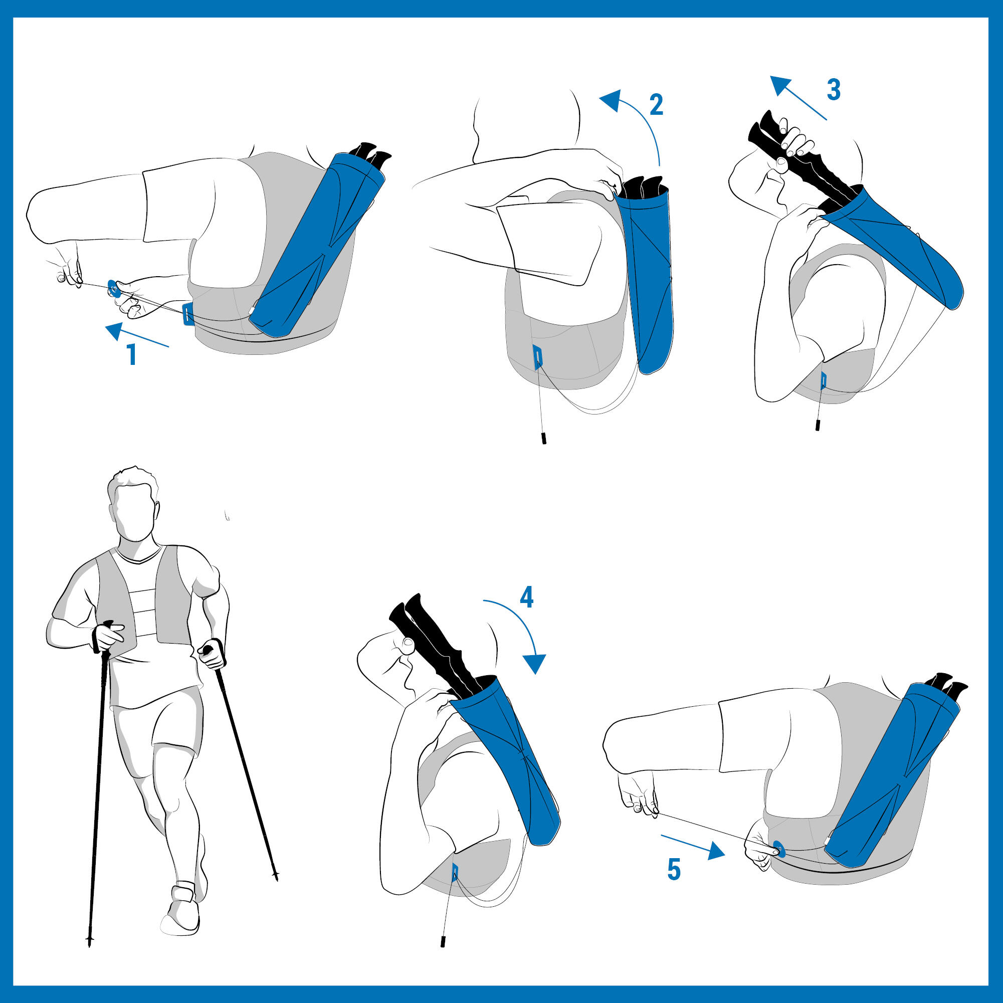 Η φαρέτρα στερεώνεται διαγώνια στο γιλέκο τρεξίματος 5L & στο μπλε σακίδιο 15L. Μπορείτε να την τοποθετήσετε στον δεξιό ή αριστερό ώμο: