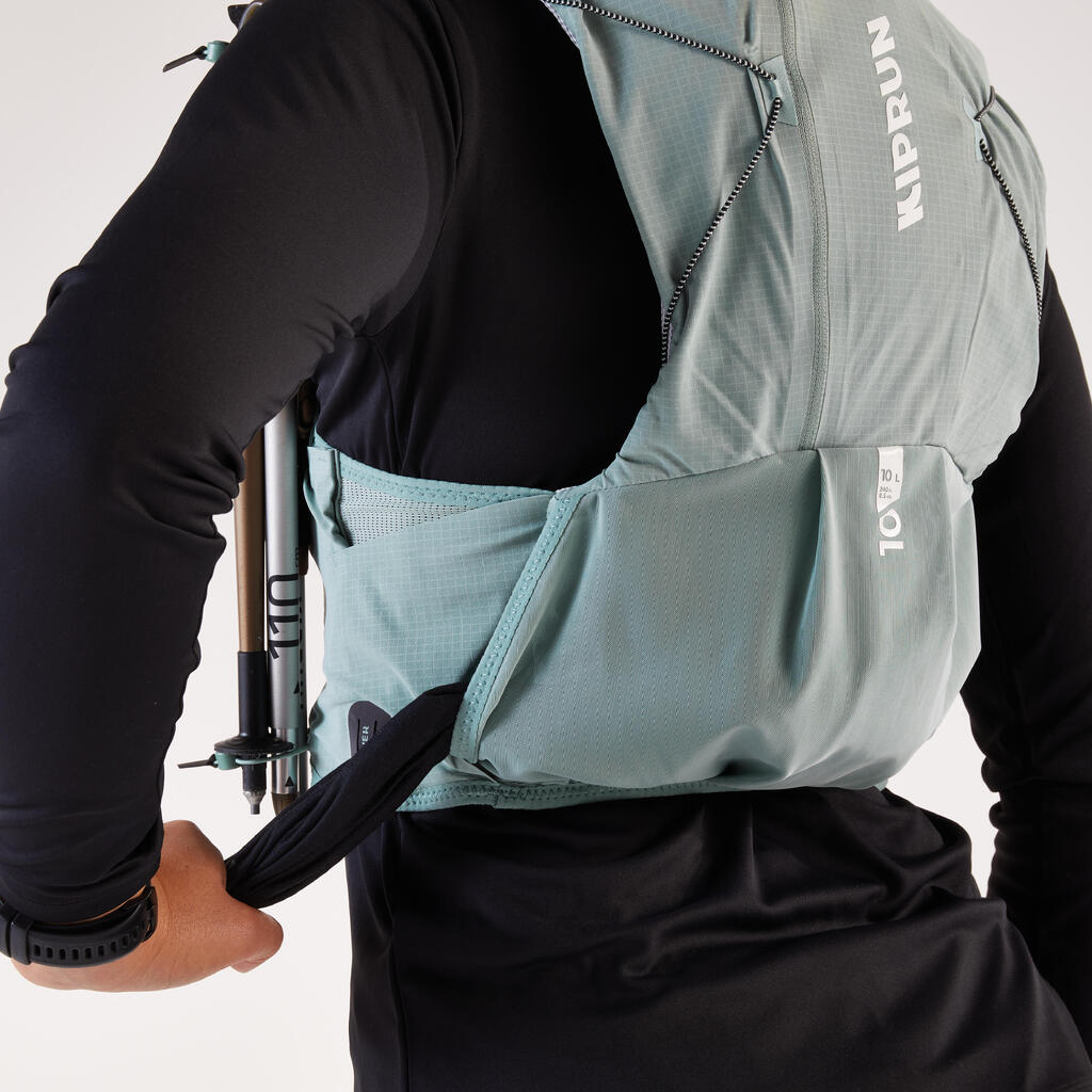 Υπάρχουν 5 τσέπες στο μπροστινό μέρος αυτού του σακιδίου ορεινού τρεξίματος 10L: 2 τσέπες για μαλακά φλασκιά 500mL (δεν περιλαμβάνονται), 1 πατενταρισμένη τσέπη με φερμουάρ, 1 αδιάβροχη τσέπη κινητού καθώς και 2 τσέπες για τα τζελ ή τις μπάρες δημητριακών σας. Επιπλέον, προσθέσαμε 2 πλαϊνές τσέπες και 4 τσέπες στο πίσω μέρος: 1 τσέπη καγκουρό, ένα μεγάλο χώρο με φερμουάρ στο πλάι που έχει δική του τσέπη με φερμουάρ, καθώς και μια μεγάλη τσέπη μεταφοράς ασκού νερού ενός λίτρου (περιλαμβάνεται).