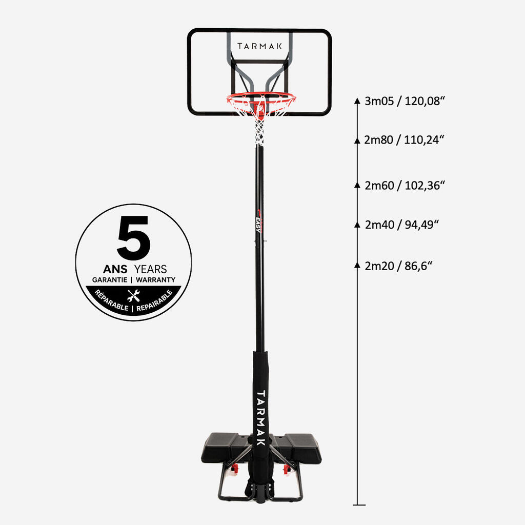 Με τη μπασκέτα B100 Easy από πολυανθρακικό δεν χρειάζεστε εργαλεία για να ρυθμίσετε το ύψος στις 5 θέσεις (από 2,20m, ιδανικό για παιδιά ηλικίας περίπου 8 ετών, έως 3,05m, που είναι το επίσημο ύψος), καθώς μπορείτε να χρησιμοποιείτε τον ενσωματωμένο δίσκο ρύθμισης και το σύστημα εγκοπών.