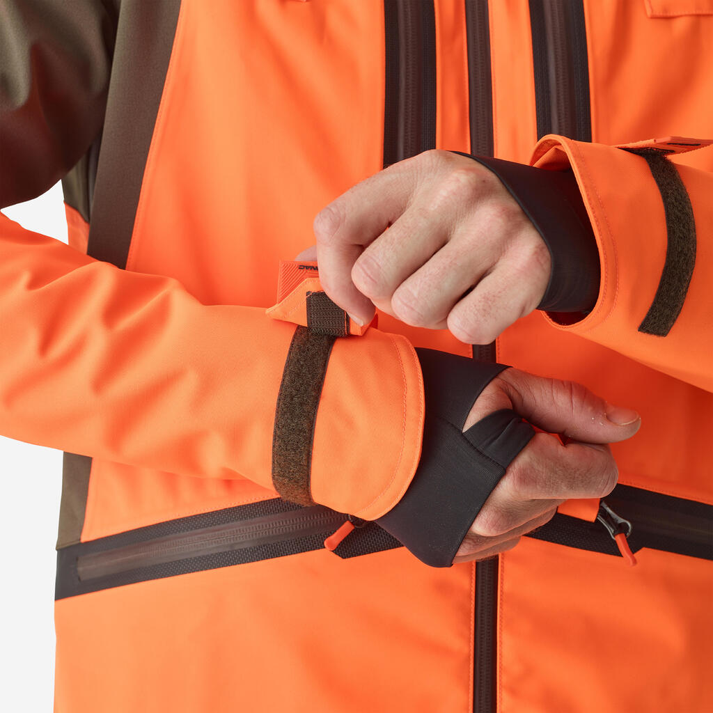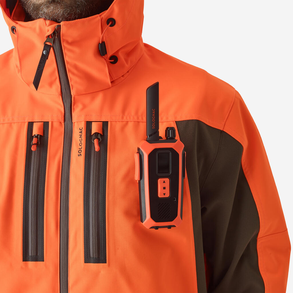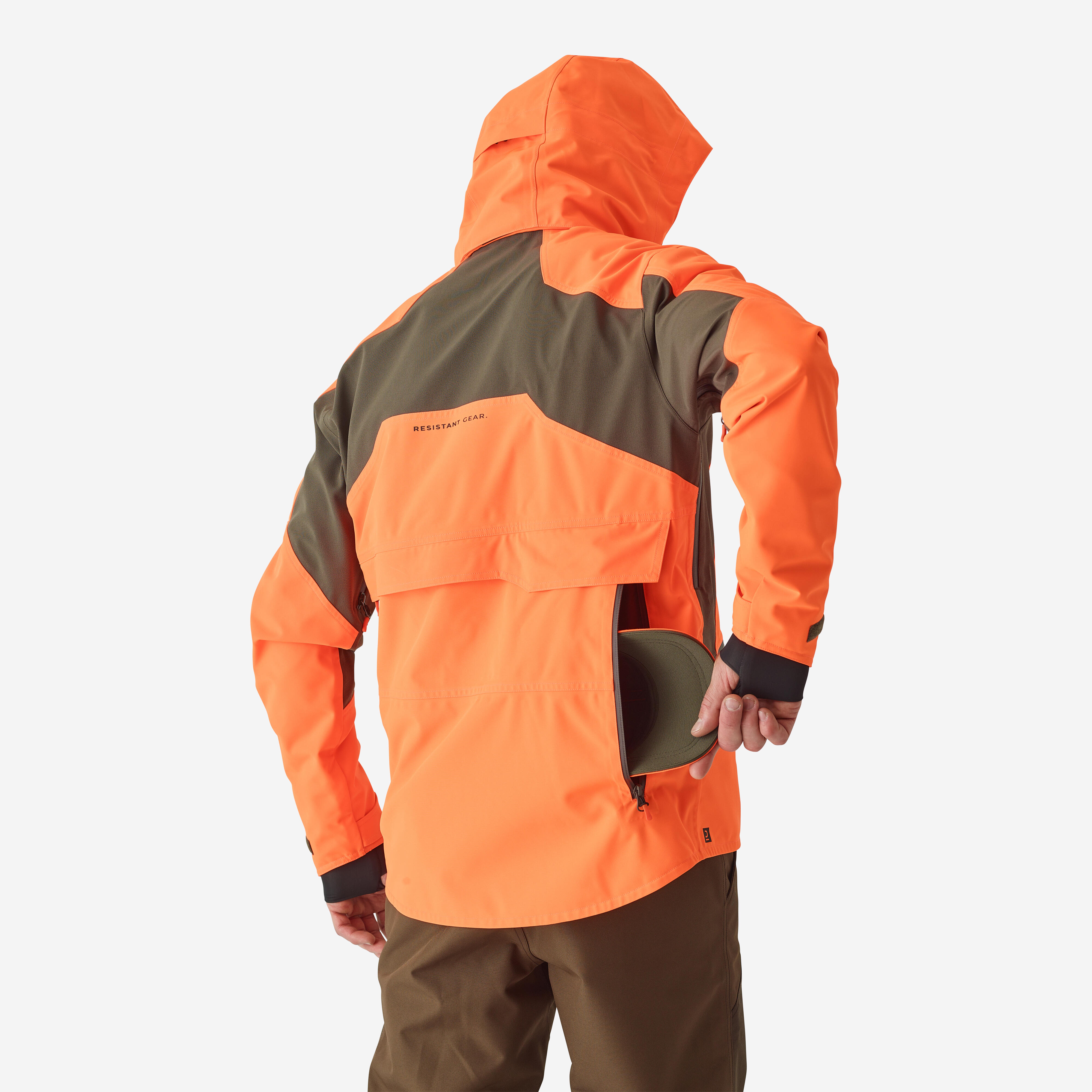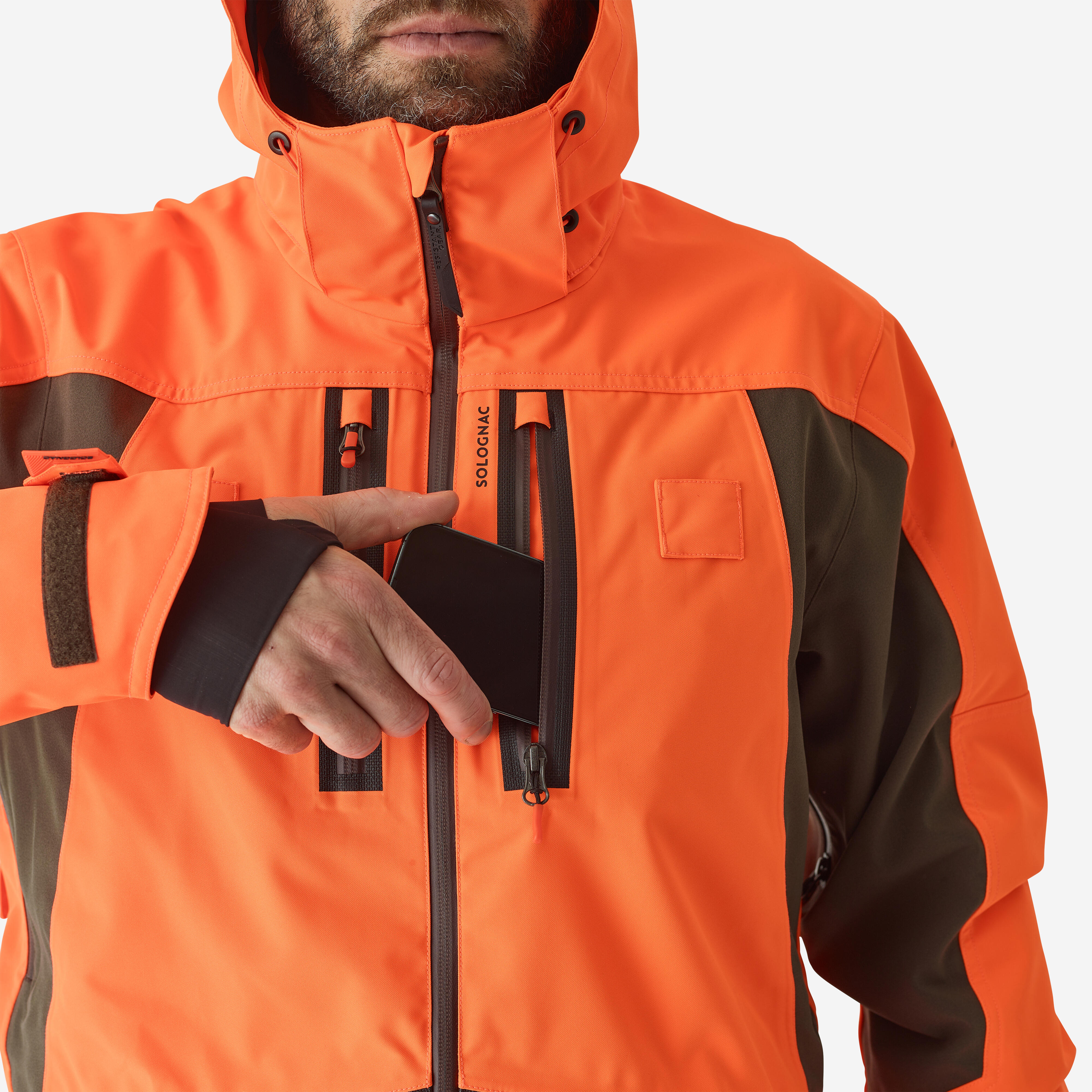 Κρατήστε τα κλειδιά σας ασφαλή, στερεώνοντάς τα στον γάντζο ασφαλείας στην μπροστινή αριστερή τσέπη. Μπορείτε επίσης να στερεώσετε το κολάρο εκπαίδευσης του σκύλου σας στο πλαϊνό λουράκι στο μπροστινό μέρος του μπουφάν. Σημείωση: η κουκούλα στο neon καφέ αδιάβροχο κυνηγετικό μπουφάν Renfort 900 μπορεί να ρυθμιστεί με κορδόνι σύσφιγξης, ώστε να μπορείτε να κυνηγάτε χωρίς περιορισμούς. Αυτό σας βοηθά να την αφαιρέσετε εύκολα όταν σταματήσει η βροχή.