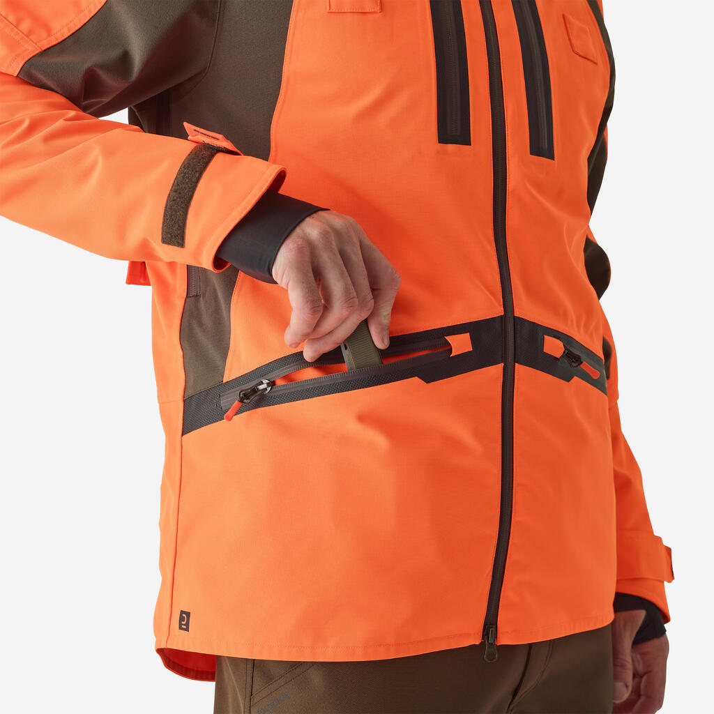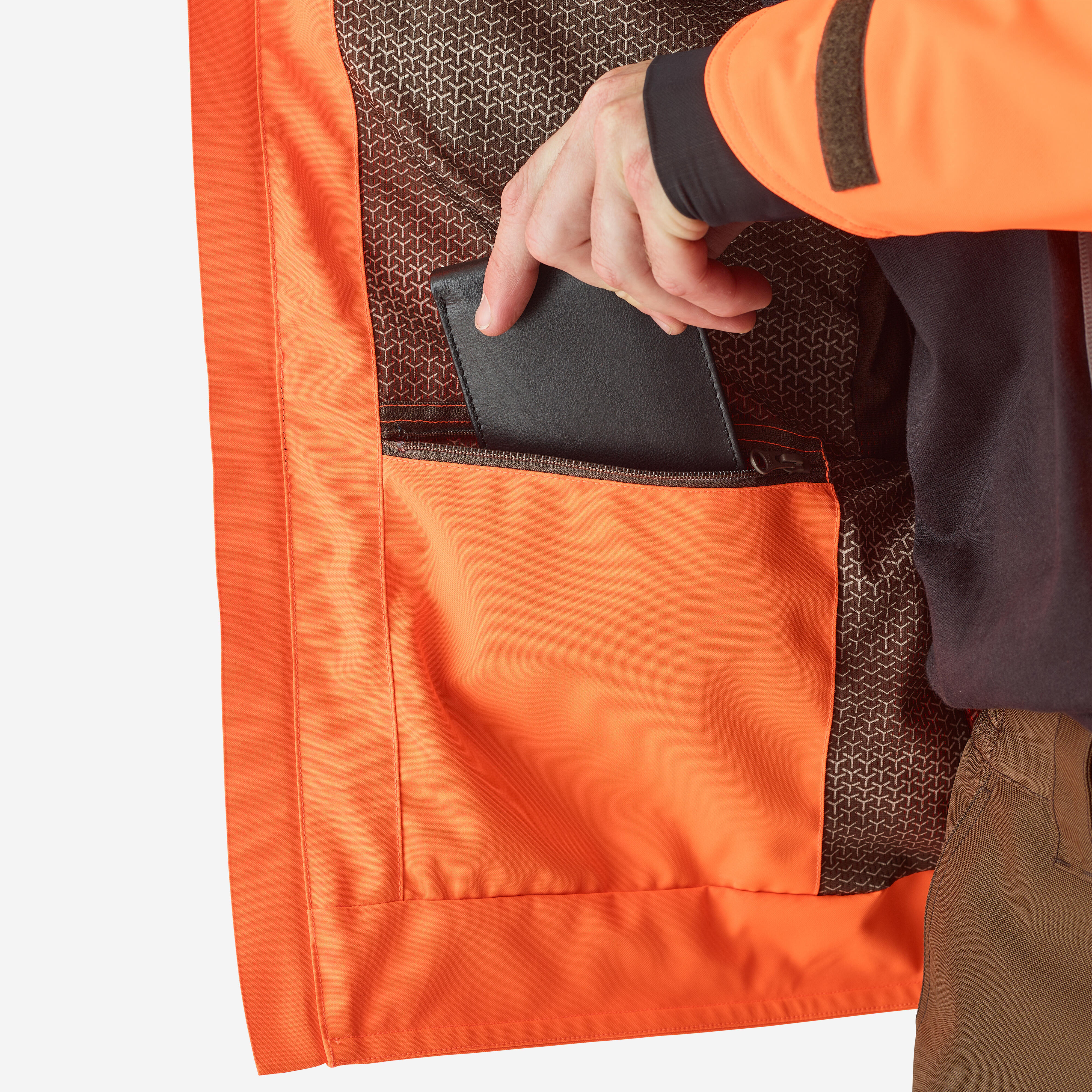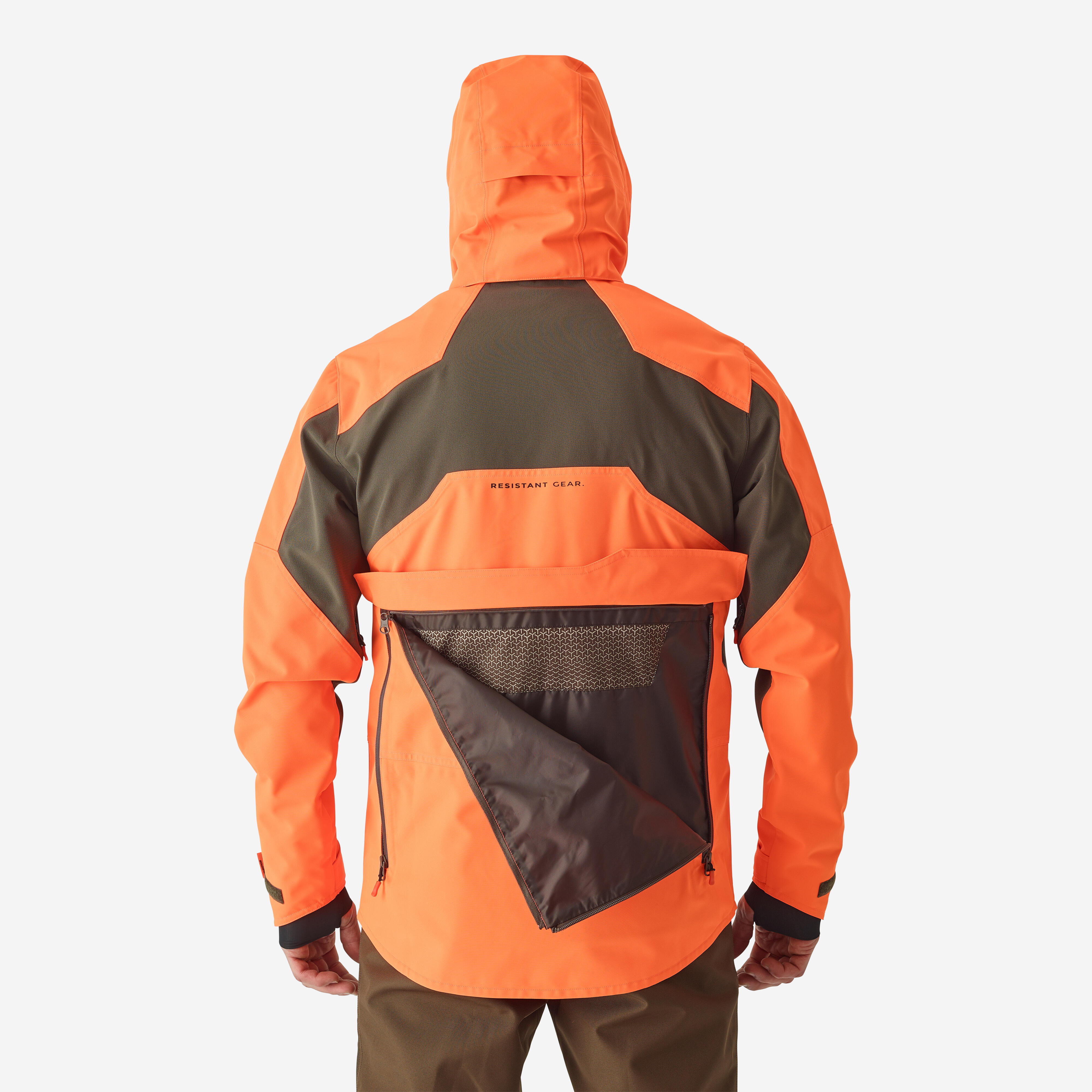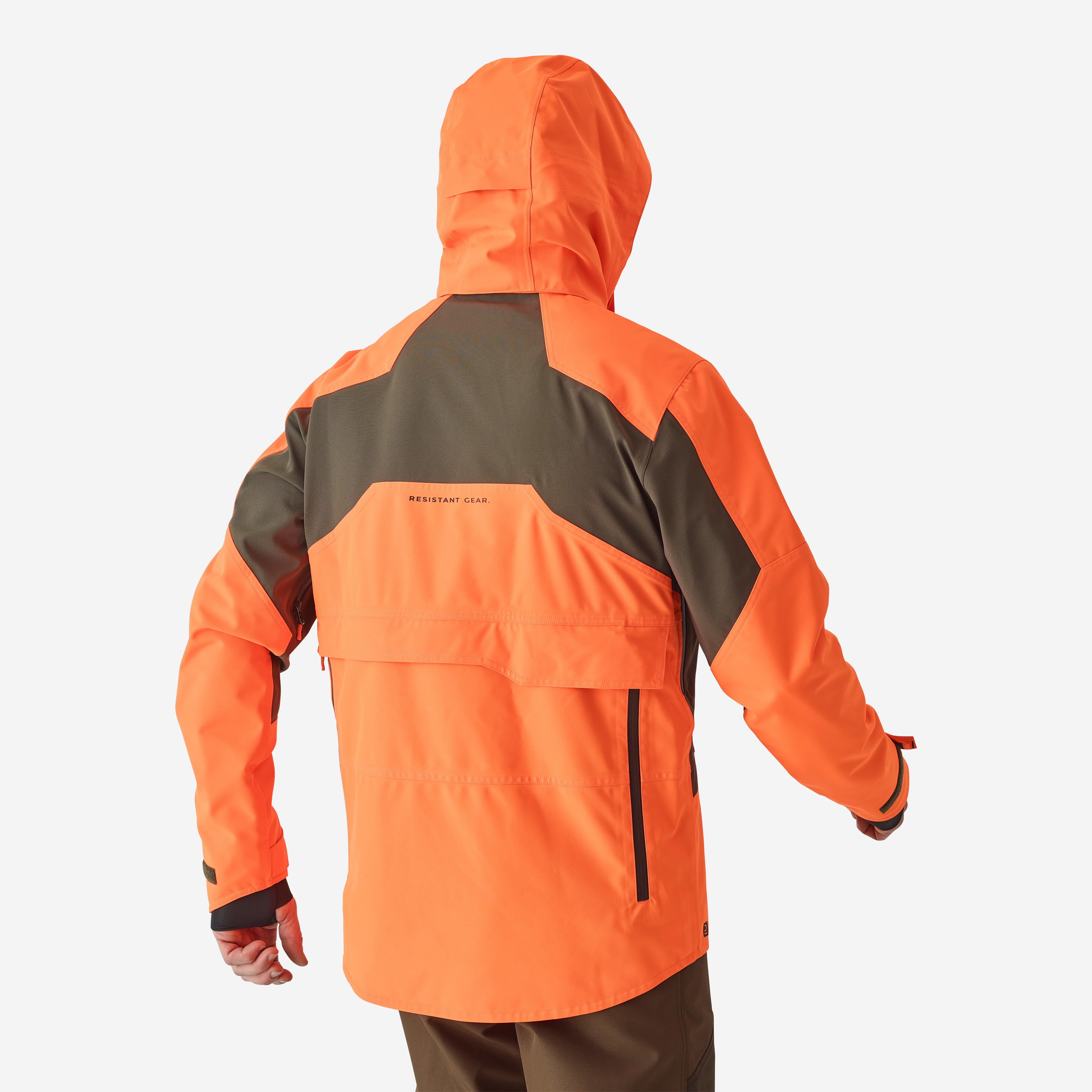 Κρατήστε τα κλειδιά σας ασφαλή, στερεώνοντάς τα στον γάντζο ασφαλείας στην μπροστινή αριστερή τσέπη. Μπορείτε επίσης να στερεώσετε το κολάρο εκπαίδευσης του σκύλου σας στο πλαϊνό λουράκι στο μπροστινό μέρος του μπουφάν. Σημείωση: η κουκούλα στο neon καφέ αδιάβροχο κυνηγετικό μπουφάν Renfort 900 μπορεί να ρυθμιστεί με κορδόνι σύσφιγξης, ώστε να μπορείτε να κυνηγάτε χωρίς περιορισμούς. Αυτό σας βοηθά να την αφαιρέσετε εύκολα όταν σταματήσει η βροχή.
