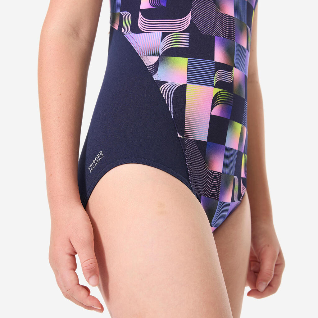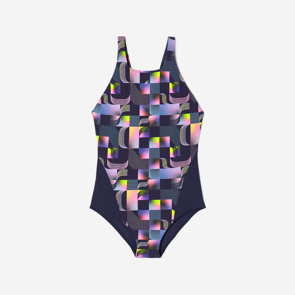 Οι φαρδιές τιράντες και η πλάτη σε σχήμα V εγγυώνται σταθερό κράτημα και ελευθερία κινήσεων. Αυτό το πολύχρωμο ολόσωμο μαγιό θα συμβαδίζει με τις προπονήσεις σας, χωρίς να φεύγει από τη θέση του.
