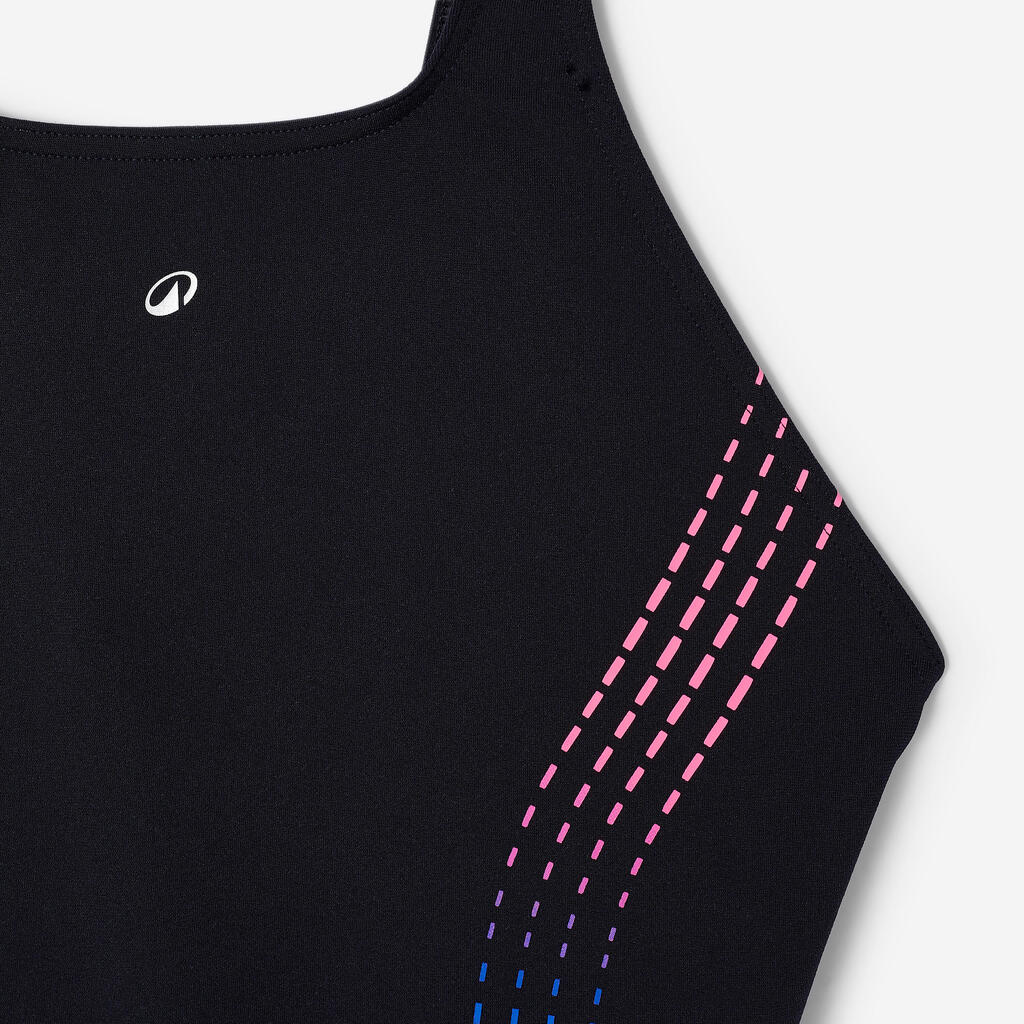 Οι φαρδιές τιράντες και η πλάτη σε σχήμα V εγγυώνται σταθερό κράτημα και ελευθερία κινήσεων. Αυτό το πολύχρωμο ολόσωμο μαγιό θα συμβαδίζει με τις προπονήσεις σας, χωρίς να φεύγει από τη θέση του.