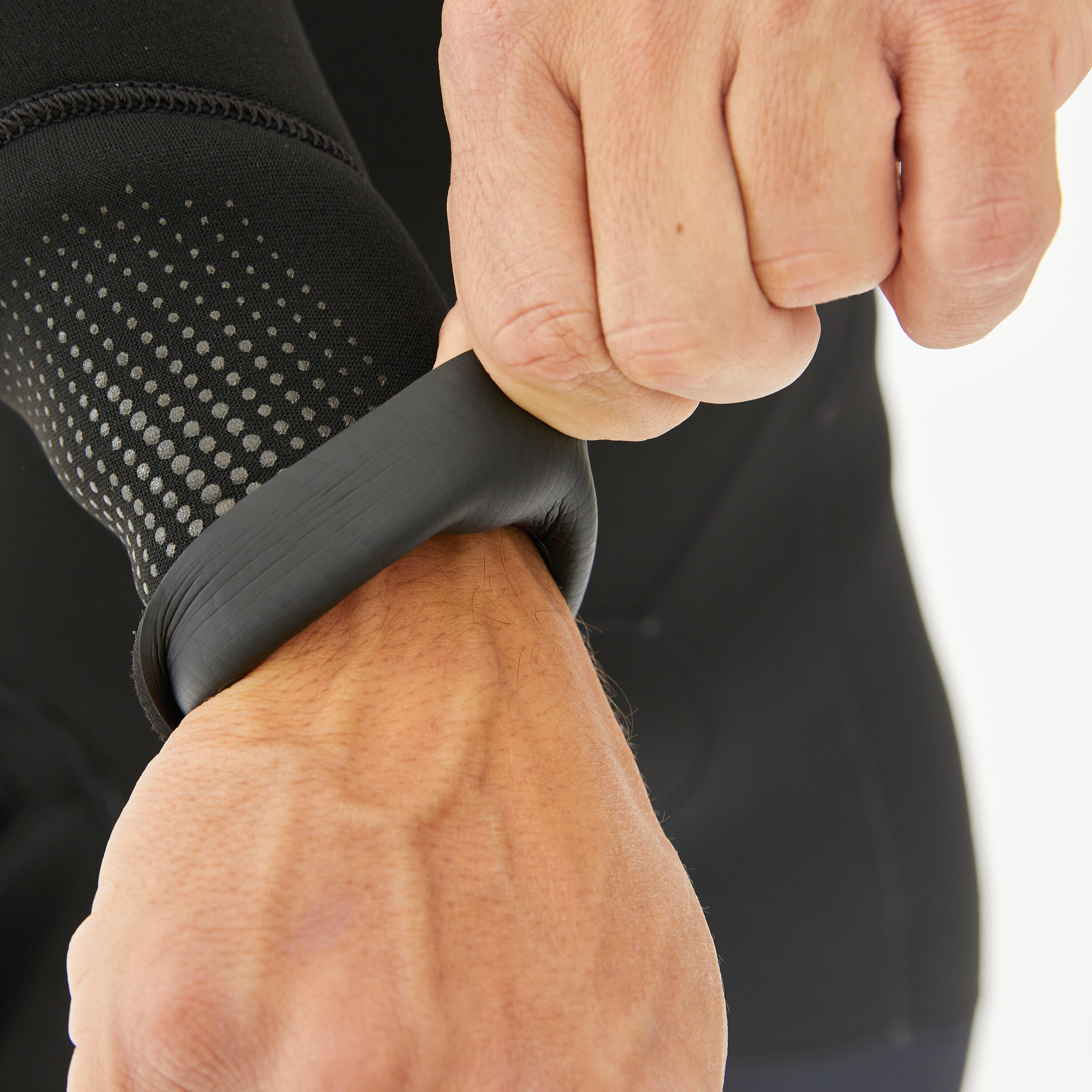 Για να ρυθμίσετε τη στολή, ζητήστε από κάποιον να φυσήξει στο μανίκι σας από τον καρπό. Ο αέρας φουσκώνει το εσωτερικό της στολής κατάδυσης και τη διαχωρίζει άμεσα από το δέρμα σας. Κατόπιν, μπορείτε εύκολα να κάνετε τις τελικές προσαρμογές.