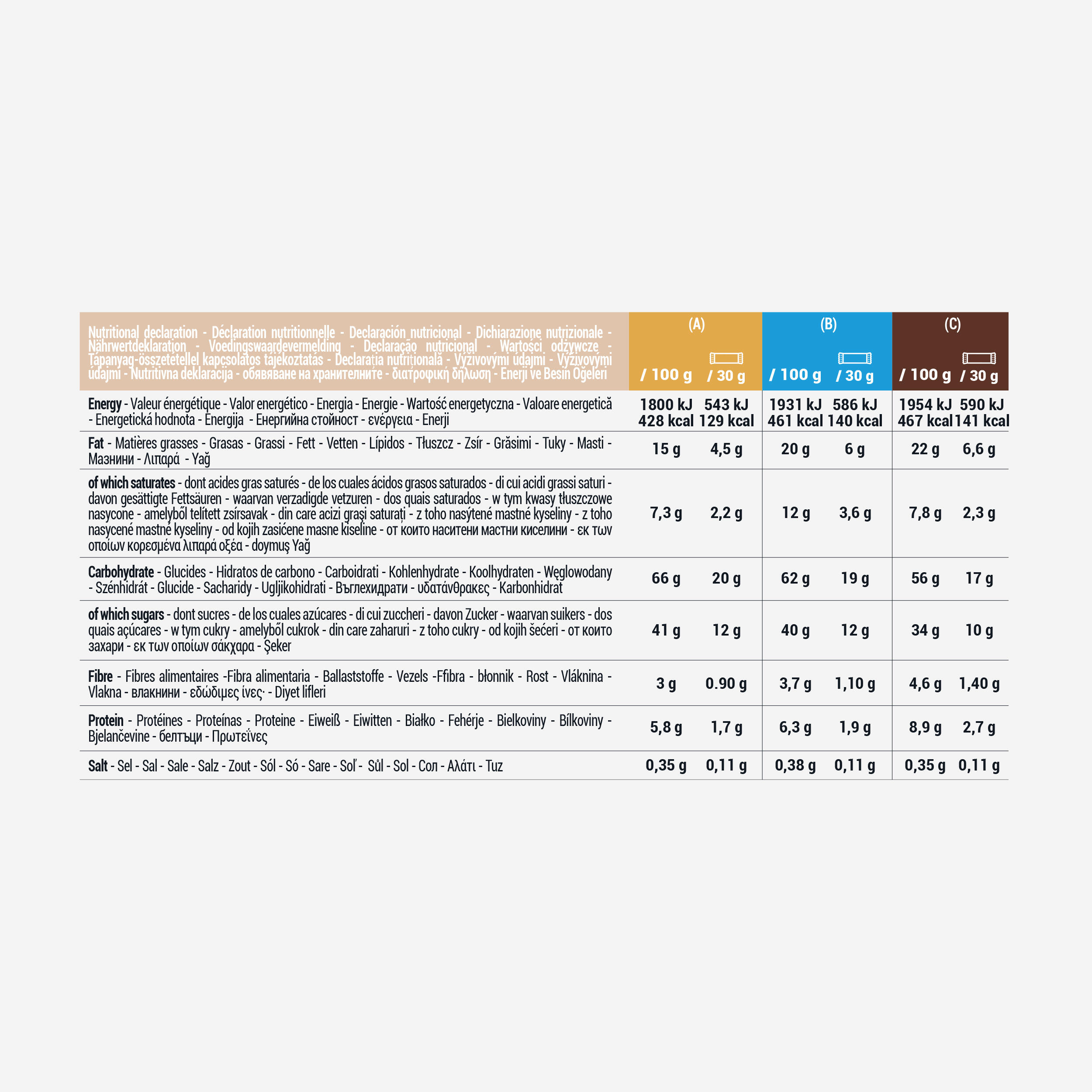 (B) Μπάρα με επικάλυψη σοκολάτας γάλακτος και καρύδα:Διατροφική αξία: 100g | 30 g (=1 μπάρα)