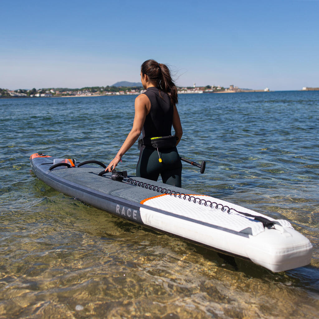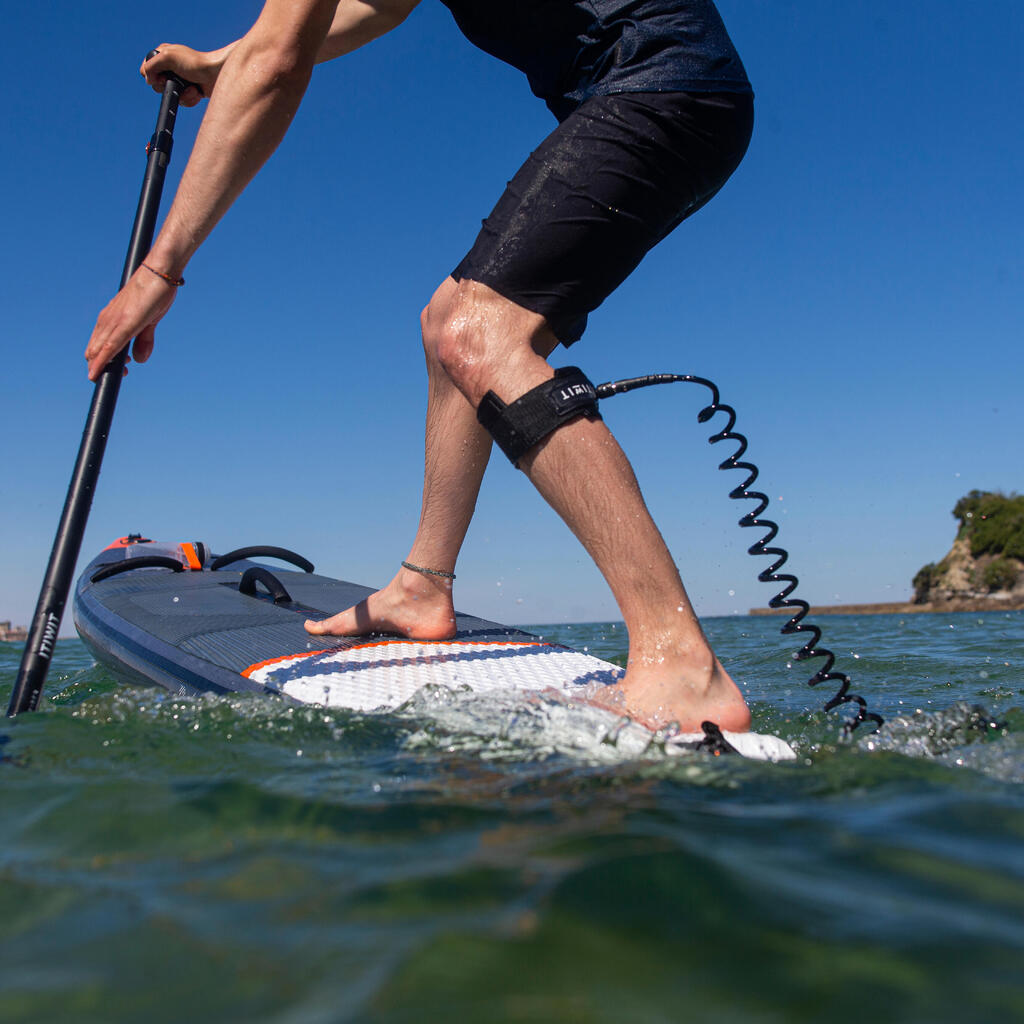 Αυτή η δέστρα για SUP έχει σχεδιαστεί με σπειροειδές καλώδιο τηλεφώνου έτσι ώστε να μην μπλέκεται στα πόδια σας, με αρκετό μήκος όταν τεντωθεί ώστε το SUP να απομακρυνθεί αν πέσετε.