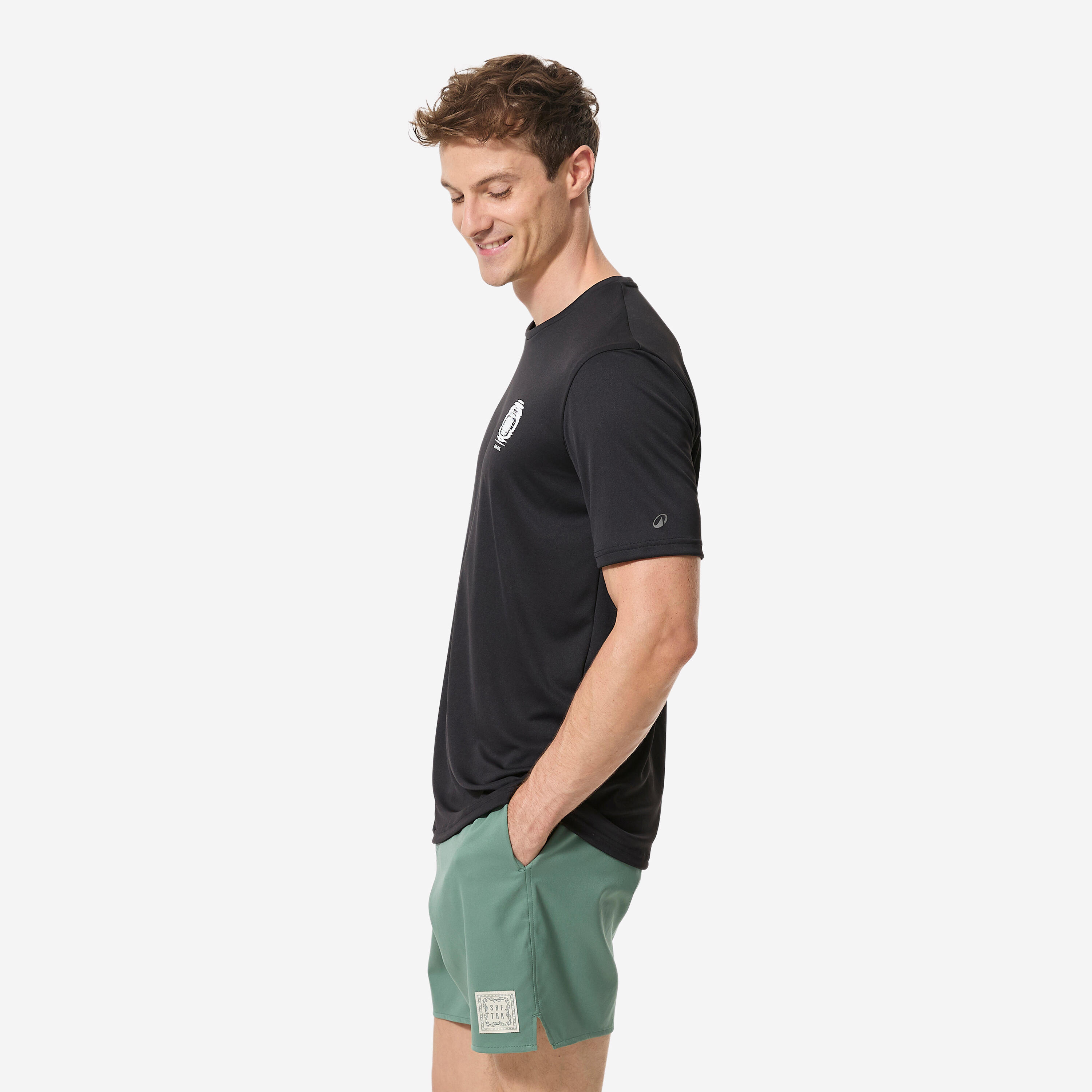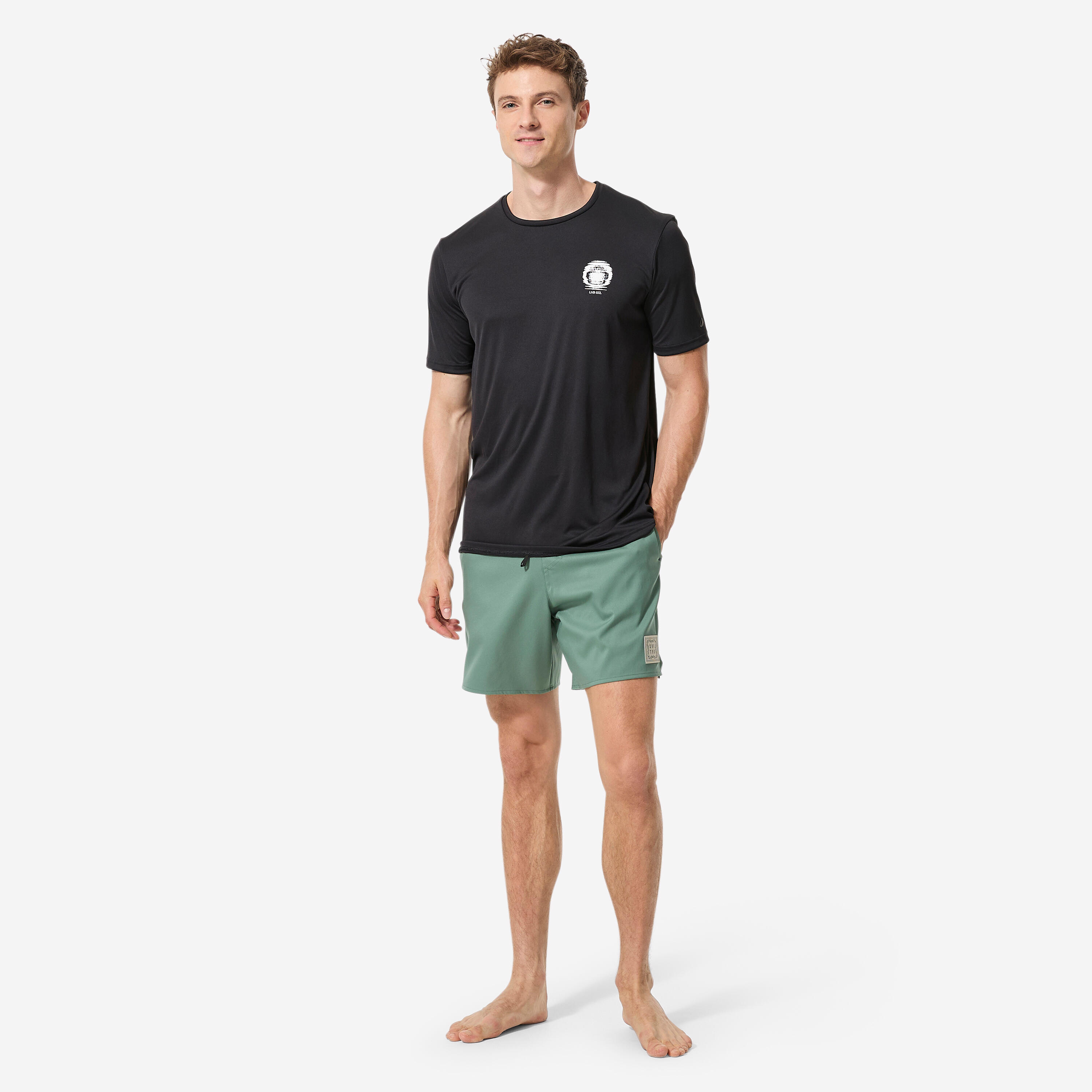 Αυτό το T-shirt αντηλιακής προστασίας διαθέτει θηλιά στο μπροστινό μέρος για να δένεται με το κορδόνι του μαγιό σορτς σας, ώστε να μην ανεβαίνει όταν κάνετε surfing. Αυτή η λύση προτείνεται για δραστηριότητες διάρκειας έως μίας ώρας. Εάν η άσκησή σας διαρκεί πάνω από 1 ώρα, προτιμήστε τη μπλούζα 500 με προστασία UV, η οποία διαθέτει επίσης κορδόνι στους γοφούς για μεγαλύτερη σταθερότητα. Όταν το T-shirt τραβιέται προς τα πάνω προκαλούνται ερεθισμοί χαμηλά στην περιοχή της κοιλιάς.