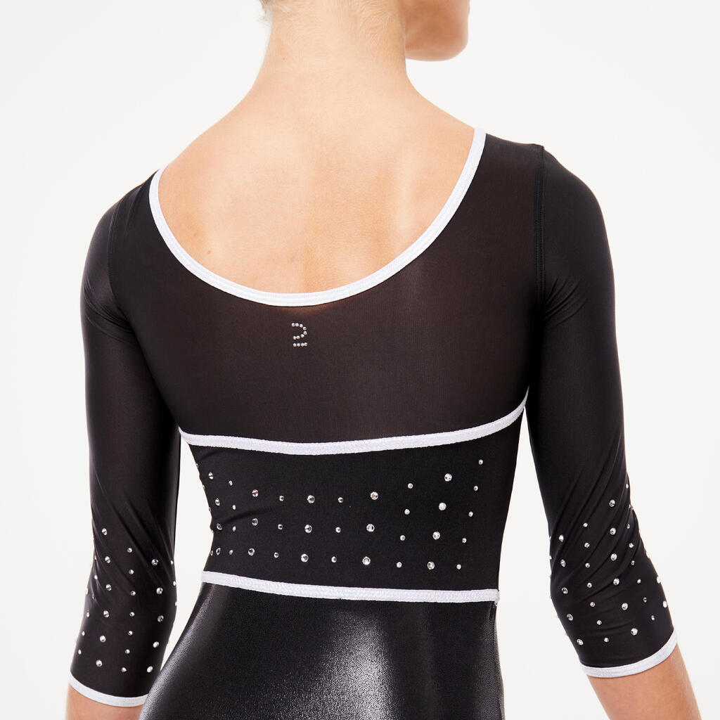 Κορμάκι Γυμναστικής με Μανίκι 3/4 για Κορίτσια-Γυαλιστερό Μαύρο Glitter με Στρας