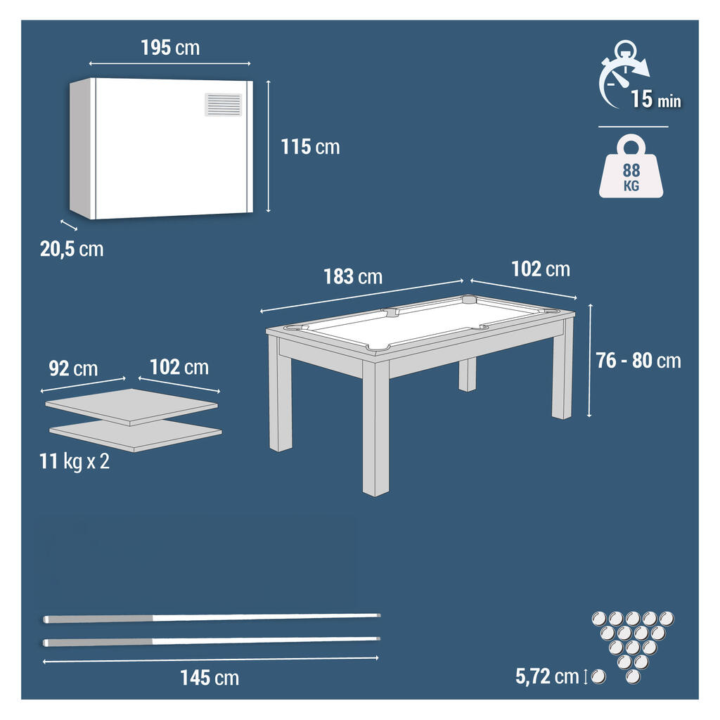 - 2 πλάκες επιφάνειας τραπεζιού (94 x 107 cm) για να μετατρέψετε το τραπέζι μπιλιάρδου σε τραπεζαρία (ή γραφείο).
