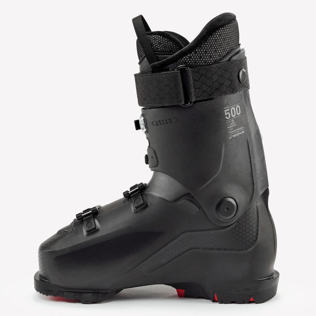 Οι μπότες σκι 500 συνοδεύονται από 4 μικρομετρικά άγκιστρα αλουμινίου, το μήκος των οποίων μπορεί να ρυθμιστεί για ακόμη μεγαλύτερο έλεγχο της σύσφιξης. Το επάνω άγκιστρο έχει 3 θέσεις για προσαρμογή σε όλα τα μεγέθη κνήμης. Φαρδύ, ρυθμιζόμενο λουράκι στην κορυφή του επάνω τμήματος για μια τελική προσαρμογή.