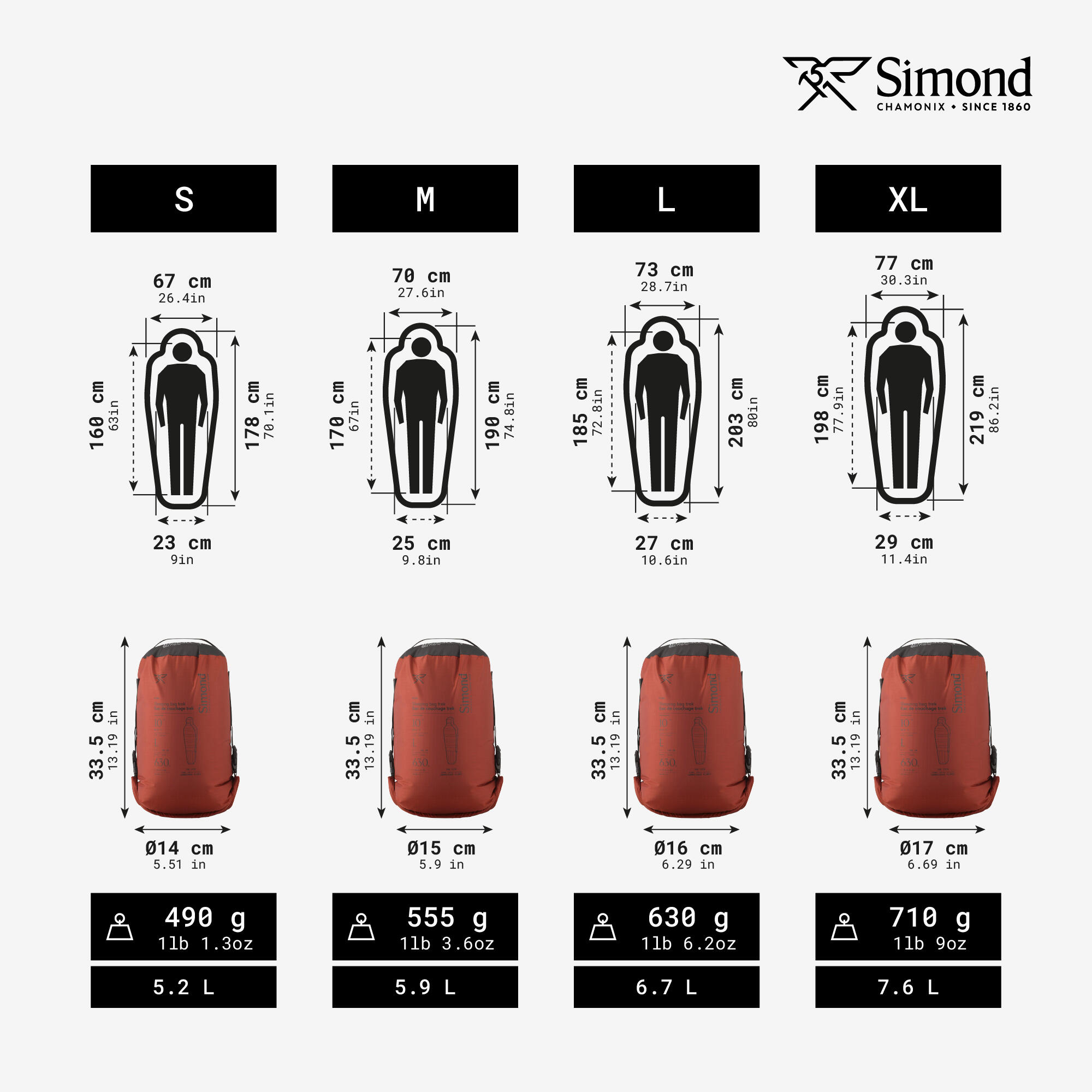 Μέγ. Μ (χρήστες 1,60-1,69 m):555 g (με 240 g πούπουλα/φτερά)Διαστάσεις διπλωμένος:Μήκος 33 cm διάμ. 15 cmΌγκος 5,9 LΜέγ. L (χρήστες 1,70-1,84 m):630 g (με 275 g πούπουλα/φτερά)Διαστάσεις διπλωμένος:Μήκος 33 cm διάμ. 16 cmΌγκος 6,7 LΜέγ. XL (χρήστες 1,85-1,98 m):710 g (με 310 g πούπουλα/φτερά)Διαστάσεις διπλωμένος:Μήκος 33 cm διάμ. 17 cmΌγκος 7,6L