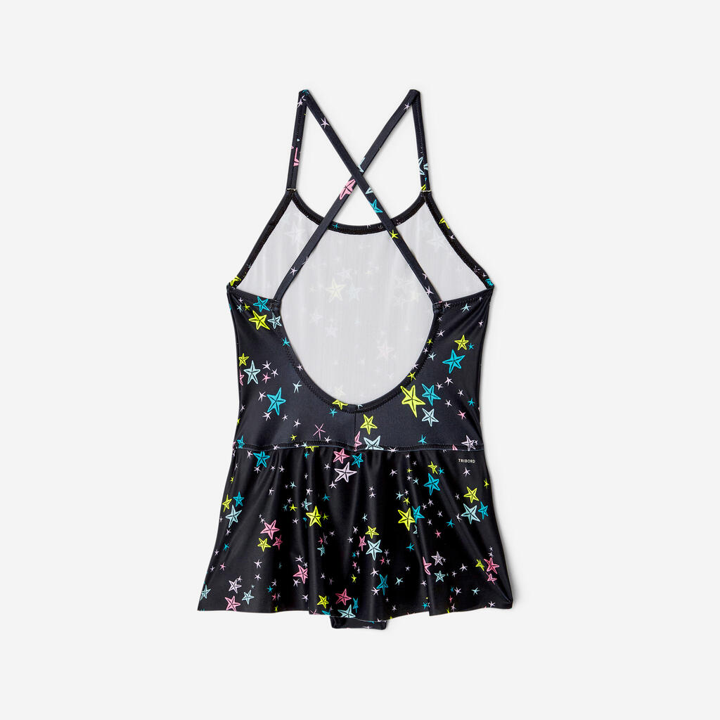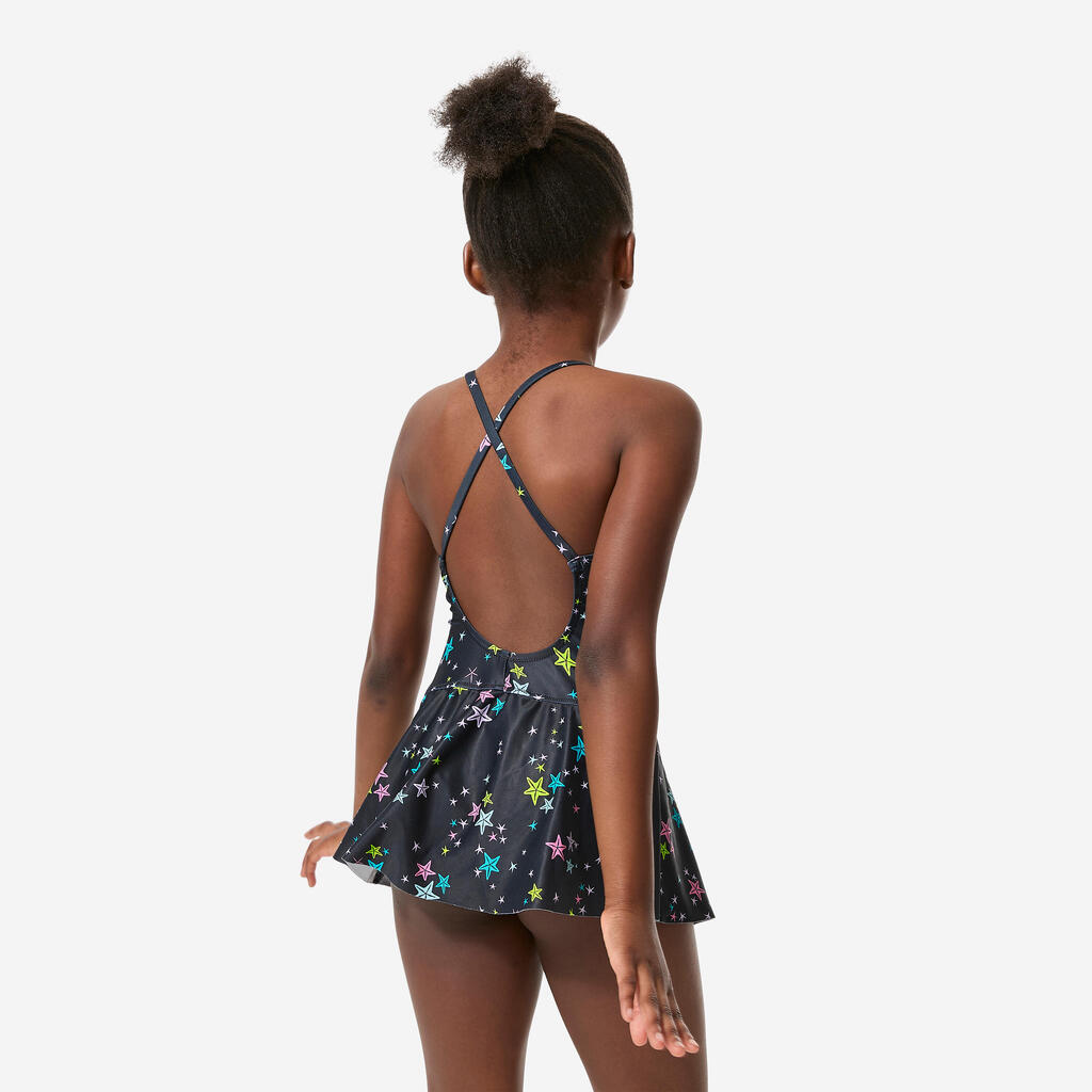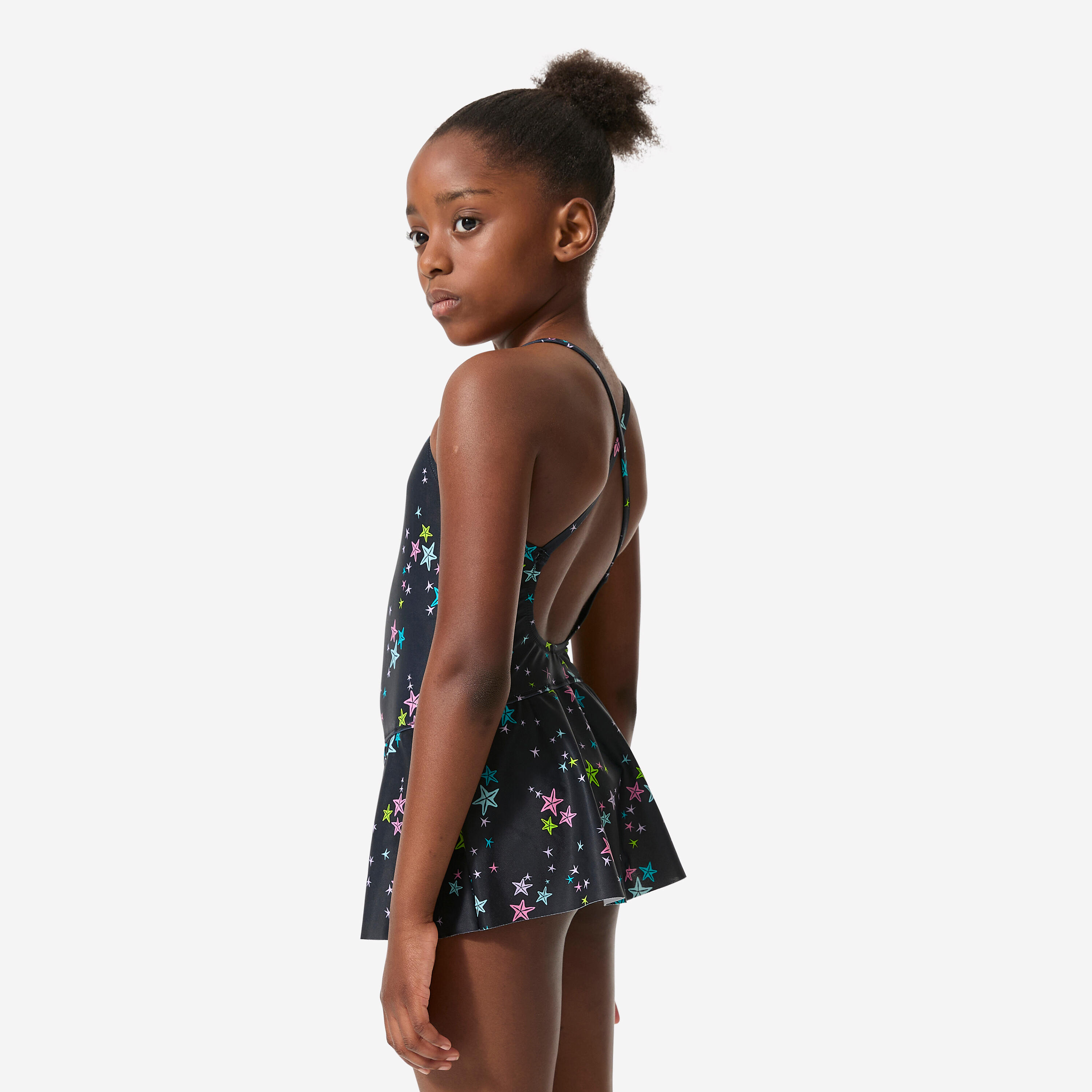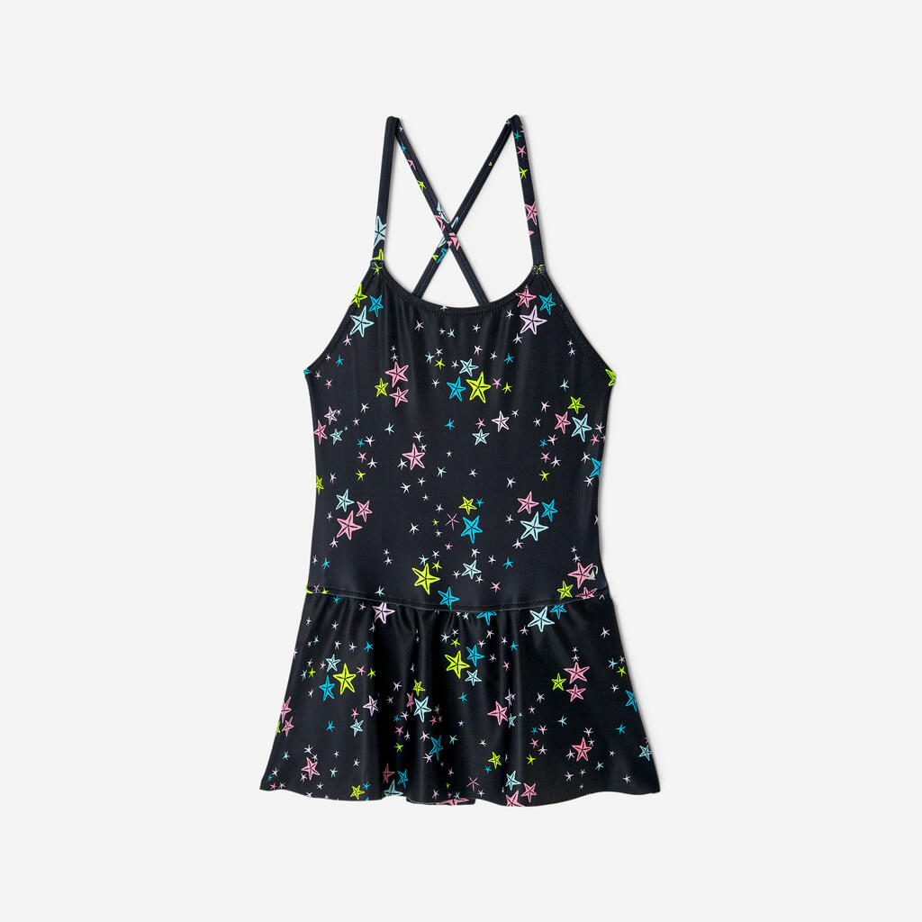 Εγγυημένη ελευθερία κινήσεων με αυτό το ολόσωμο μαγιό για κορίτσια με τις λεπτές χιαστί τιράντες και την ανοιχτή πλάτη. Το έξτρα πλεονέκτημα; Η στιλάτη κοριτσίστικη γραμμή του με φούστα!