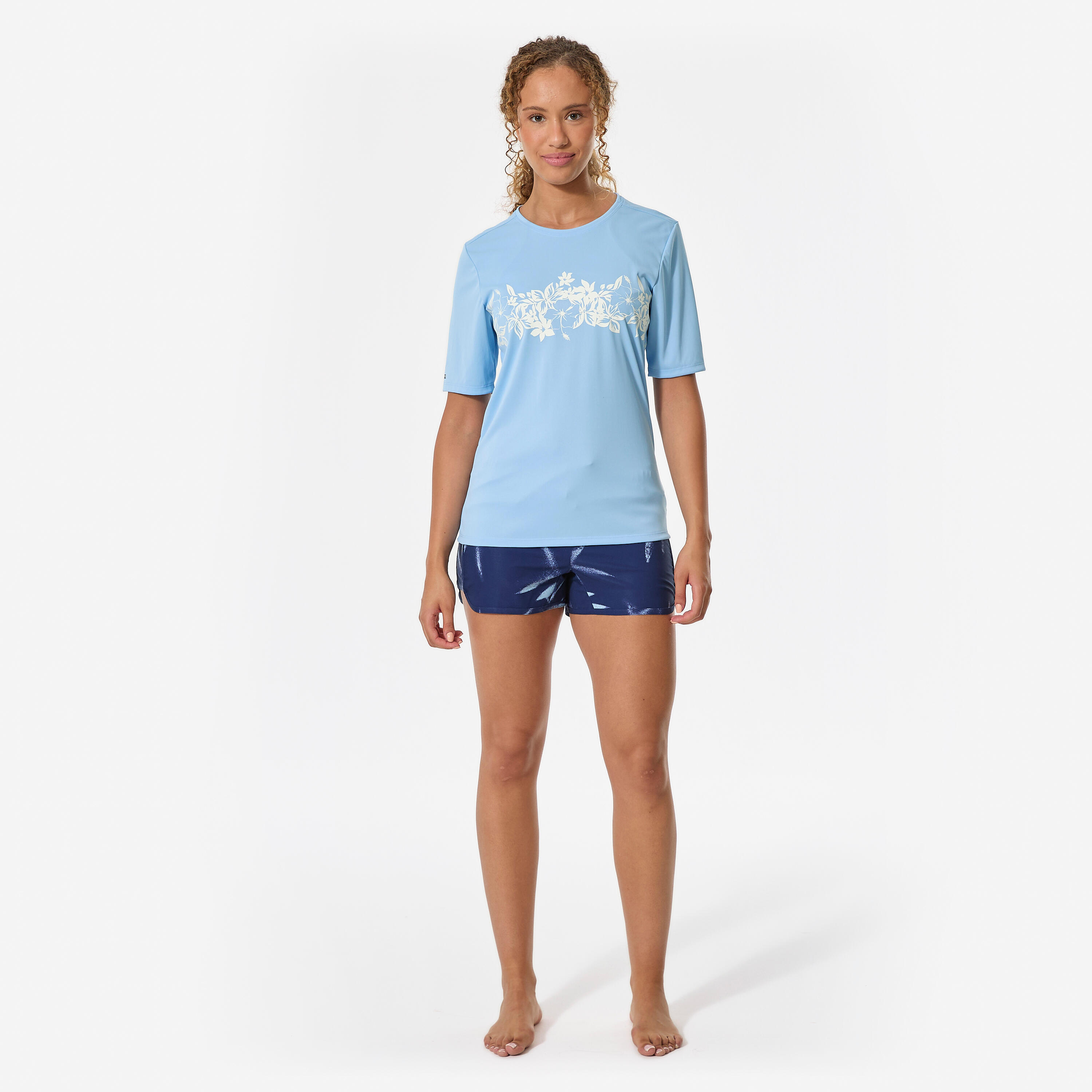 Αυτό το κοντομάνικο μπλουζάκι προστατεύει από τον ήλιο, ακόμα και μέσα στο νερό, και μειώνει την τριβή.Η χαλαρή εφαρμογή και το μοτίβο χαρίζουν στυλ τόσο στην παραλία όσο και στο νερό.