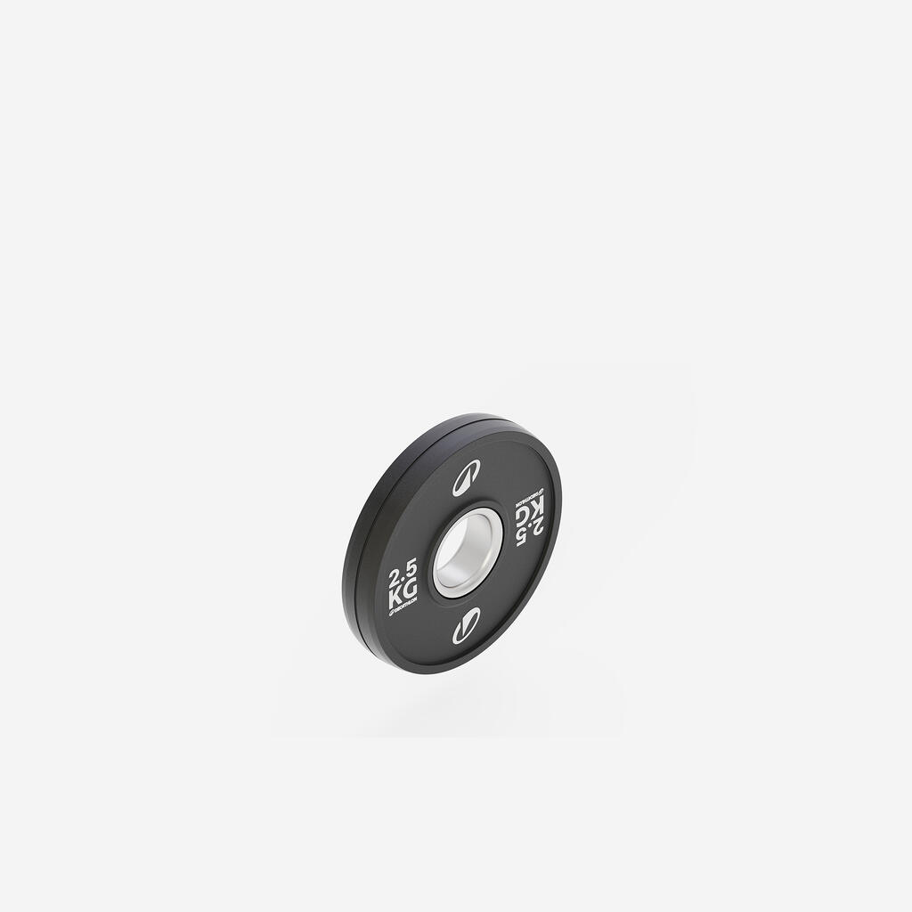 Δίσκος 2,5 kg για άρση βαρών, με φαρδιά, λοξά άκρα για απόλυτο κράτημα χωρίς προσπάθεια ή εμπλοκές.Διαθέσιμος από 0,5 kg έως 20 kg.