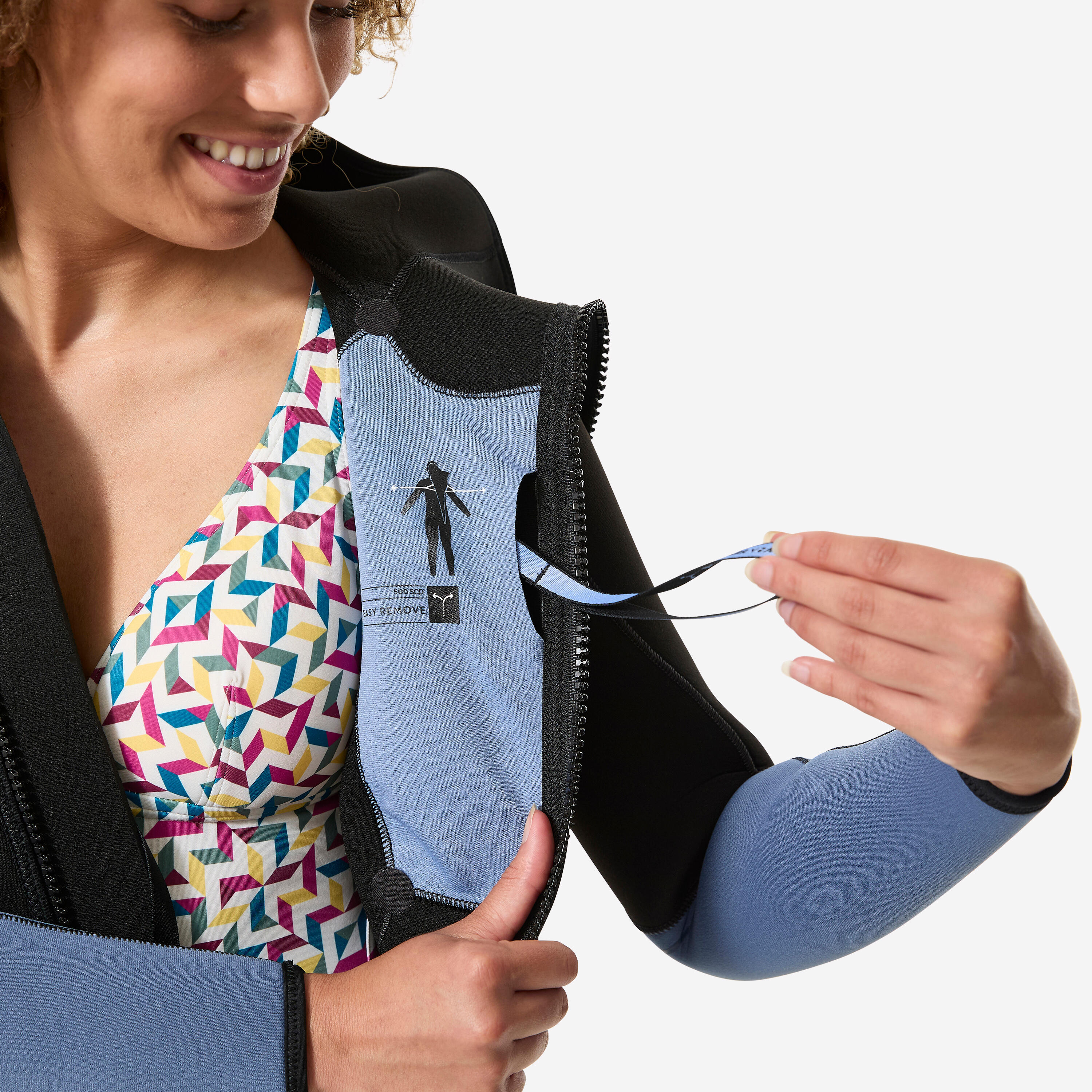Μια γυναικεία στολή που αφαιρείται στη στιγμή. Το πατενταρισμένο σύστημα με ταινία έλξης και το ευρύ διαγώνιο άνοιγμα σας επιτρέπουν να τη βγάζετε δύο φορές πιο γρήγορα, ακόμη και βρεγμένη!