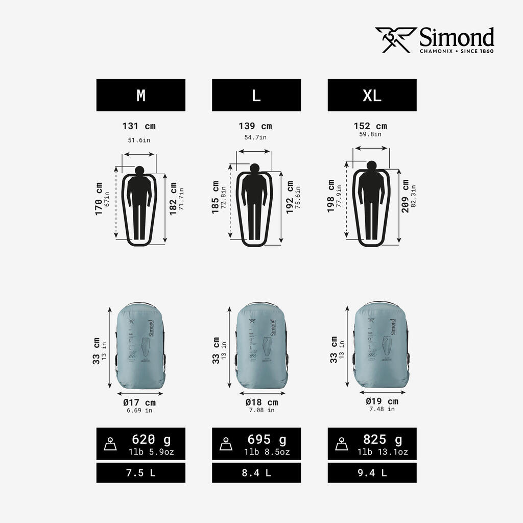 Μέγ. XL (χρήστες από 1,85 έως 2 m):765g μόνο για το πάπλωμα (συμπερ. 500g πούπουλα/φτερά). Διαστάσεις διπλωμένο:Π 33 cm Ø 19 cmΌγκος 9,4L μη συμπιεσμένο. Συνολικό μήκος: 209cm.