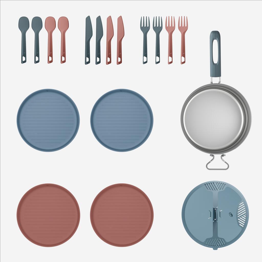Τα εξαρτήματα αποθηκεύονται μέσα στο σετ μαγειρικής. Πρώτα τα 4 πιάτα, έπειτα τα μαχαιροπίρουνα τα οποία κουμπώνουν μαζί. Μετά τοποθετήσετε το καπάκι και ασφαλίστε το σετ με την αναδιπλούμενη λαβή.