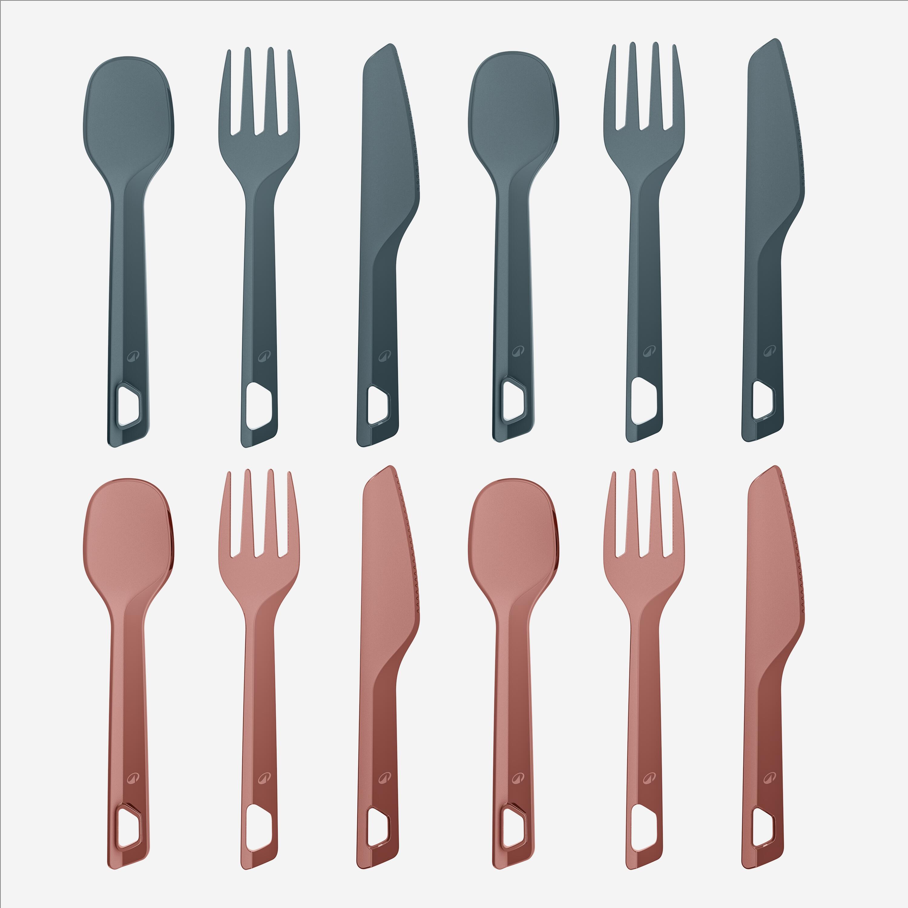 Επιλέξαμε πολυαμίδιο (μαχαιροπίρουνα και λαβή), πολυπροπυλένιο (πιάτα) και Tritan (καπάκι) επειδή είναι ελαφριά υλικά και πολύ ανθεκτικά στη θερμότητα (τουλάχιστον 100°C), σε κρούσεις και παραμόρφωση.