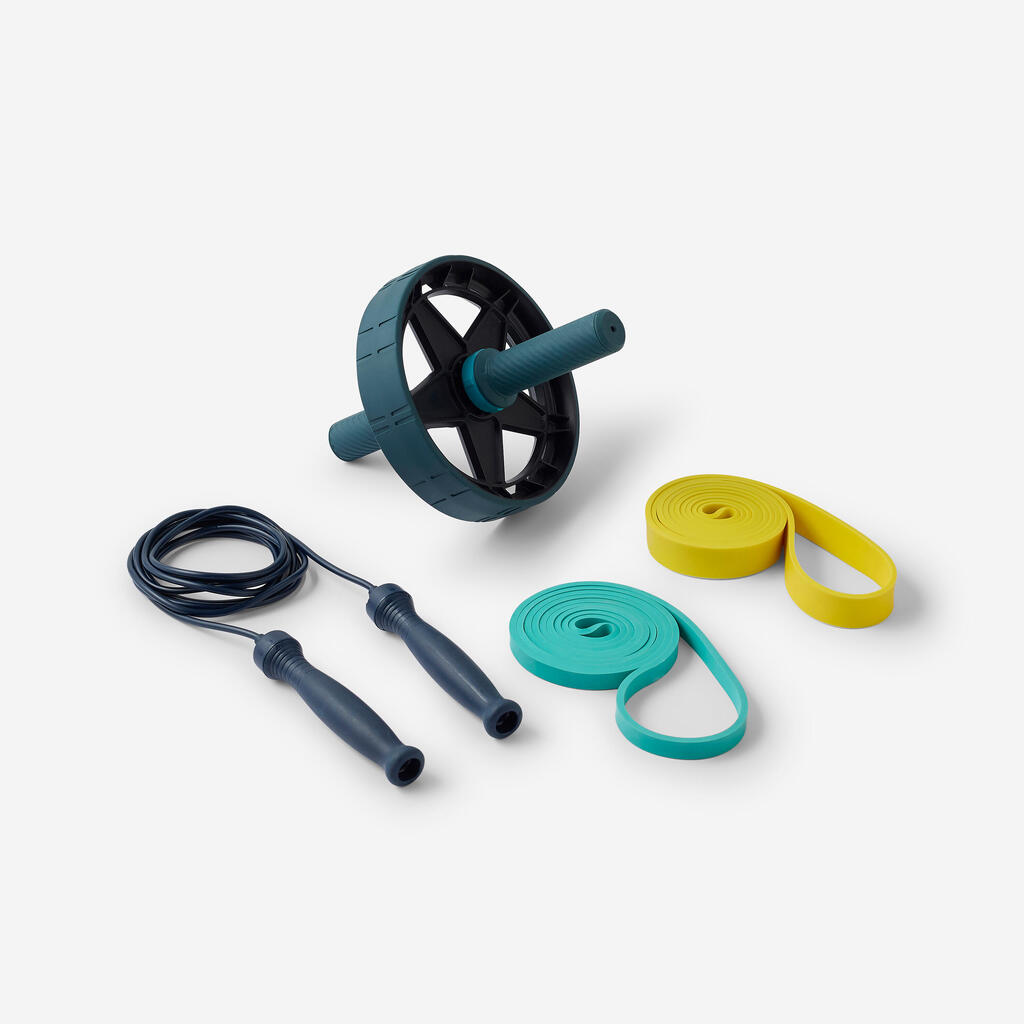 Σχοινάκι, λάστιχα προπόνησης 15 και 25 kg, τροχός κοιλιακών: όλος ο εξοπλισμός για ενίσχυση της απόδοσης, σε ένα πακέτο. Μυϊκή ενδυνάμωση, κινητικότητα, αεροβική — πολυδιάστατη, αποτελεσματική άσκηση.