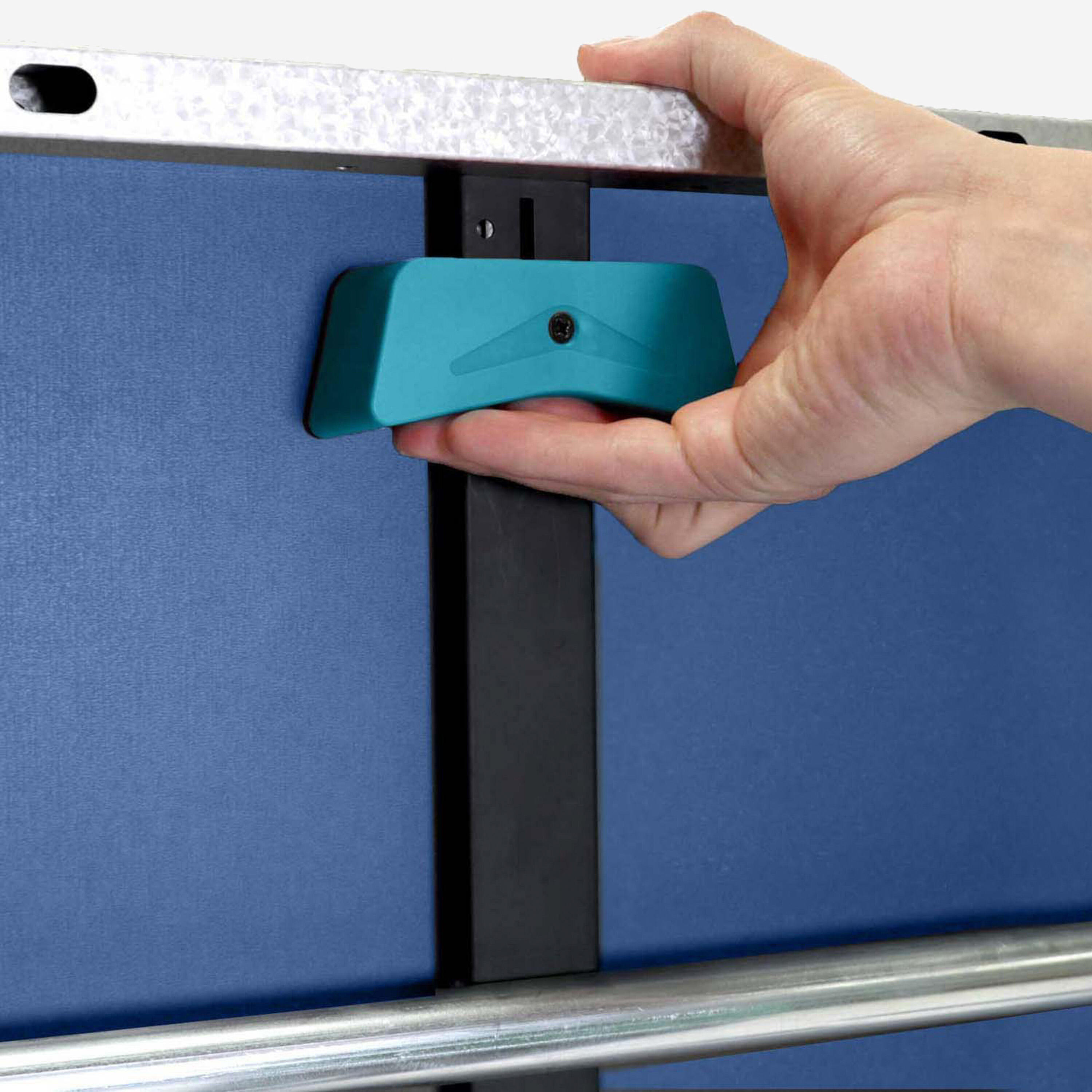 Το τραπέζι 300 Indoor είναι εξοπλισμένο με ένα καινοτόμο σύστημα που κάνει τη ρύθμιση των ποδιών παιχνιδάκι.Απλώς γυρίστε το περιστροφικό κουμπί για να ρυθμίσετε το ύψος του τραπεζιού χωρίς κόπο.Ο μηχανισμός ρύθμισης είναι ανεξάρτητος από τα πόδια και δεν έρχεται σε άμεση επαφή με το έδαφος. Απλό και αποτελεσματικό.