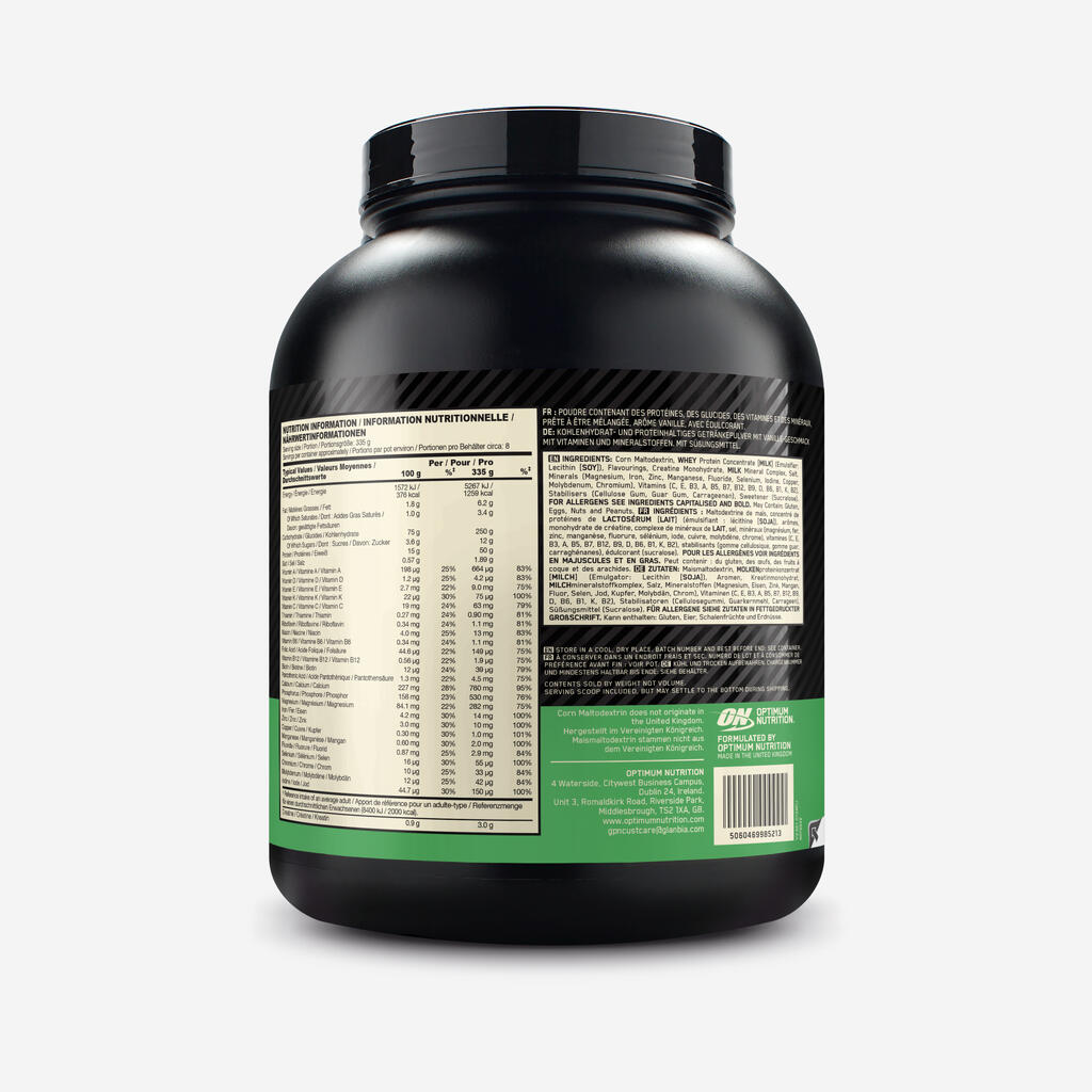 Μαλτροδεξίνη, συμπύκνωμα πρωτεΐνης ΟΡΟΥ ΓΑΛΑΚΤΟΣ [ΓΑΛΑ], ΚΑΖΕΪΝΙΚΟ ασβέστιο [ΓΑΛΑ], αρωματικές ύλες, μονοϋδρική κρεατίνη, σύμπλεγμα μετάλλων ΓΑΛΑΚΤΟΣ, τριγλυκερίδια μέσης αλύσου [ΓΑΛΑ], αλβουμίνη αυγού, φωσφορικό κάλιο, χλωριούχο νάτριο, μείγμα βιταμινών και μετάλλων (L-ασκορβικό νάτριο, πυροφωσφορικός σίδηρος, οξεϊκή D-α-τοκοφερόλη, νικοτιναμίδιο, οξείδιο του ψευδαργύρου, οξικό ρετινίλιο, D-παντοθενικό ασβέστιο, φθοριούχο νάτριο, θειικό μαγγάνιο, ιωδιούχο κάλιο, κυανοκοβαλαμίνη, D-βιοτίνη, χλωριούχο χρώμιο (III), πτεροϋλομονογλουταμικό οξύ, χοληκαλσιφερόλη, σεληνιώδες νάτριο, κιτρικός χαλκός, υδροχλωρική πυριδοξίνη, υδροχλωρική θειαμίνη, φυλλοκινόνη, ριβοφλαβίνη, μολυβδενικό νάτριο), πεπτίδια γλουταμίνης [ΓΛΟΥΤΕΝΗ ΣΙΑΤΑΡΙΟΥ], L-γλουταμίνη, οξείδιο μαγνησίου, ΟΡΟΣ ΓΑΛΑΚΤΟΣ σε σκόνη [ΓΑΛΑ], ινοσιτόλη, L-ασκορβικό οξύ, γλυκαντικό (σουκραλόζη), αντιοξειδωτικό (εκχύλισμα πλούσιο σε τοκοφερόλες), D-παντοθενικό ασβέστιο, πτεροϋλομονογλουταμικό οξύ.