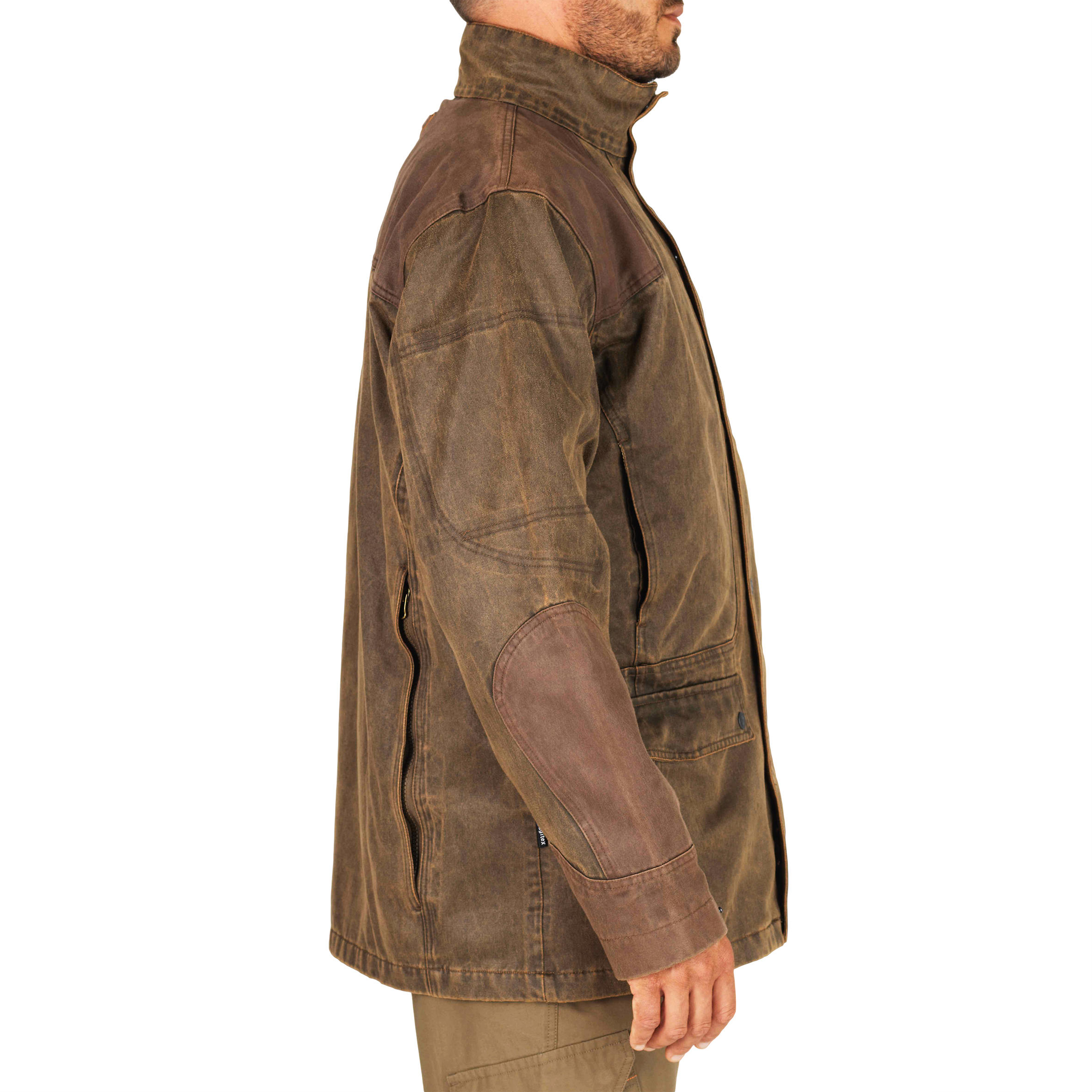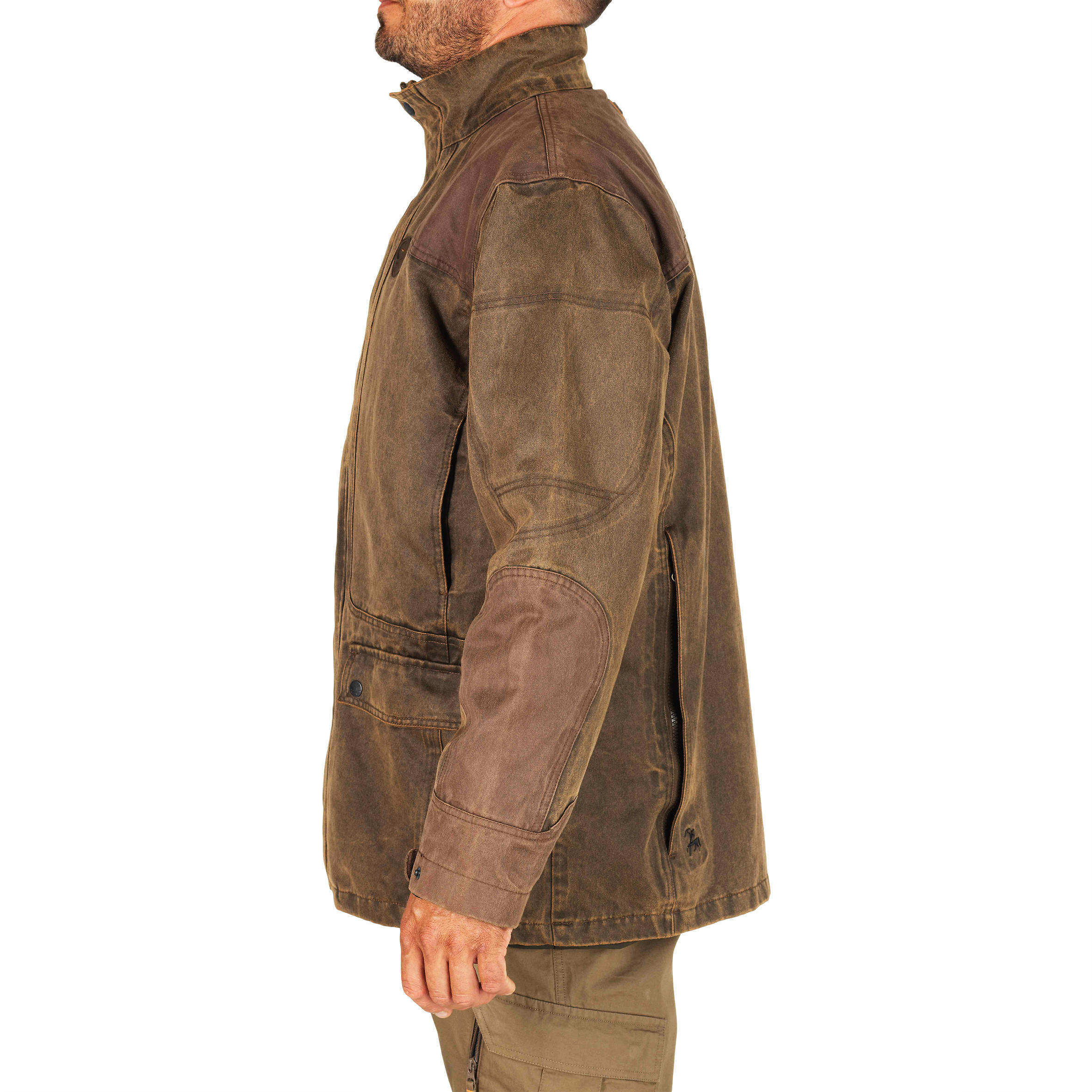 Αυτό το καφέ κυνηγετικό μπουφάν είναι αδιάβροχο και ανθεκτικό. Διαθέτει πολλαπλές τσέπες, συμπεριλαμβανομένης μιας μεγάλης θήκης θηραμάτων με επένδυση PVC και τεσσάρων εσωτερικών τσεπών.