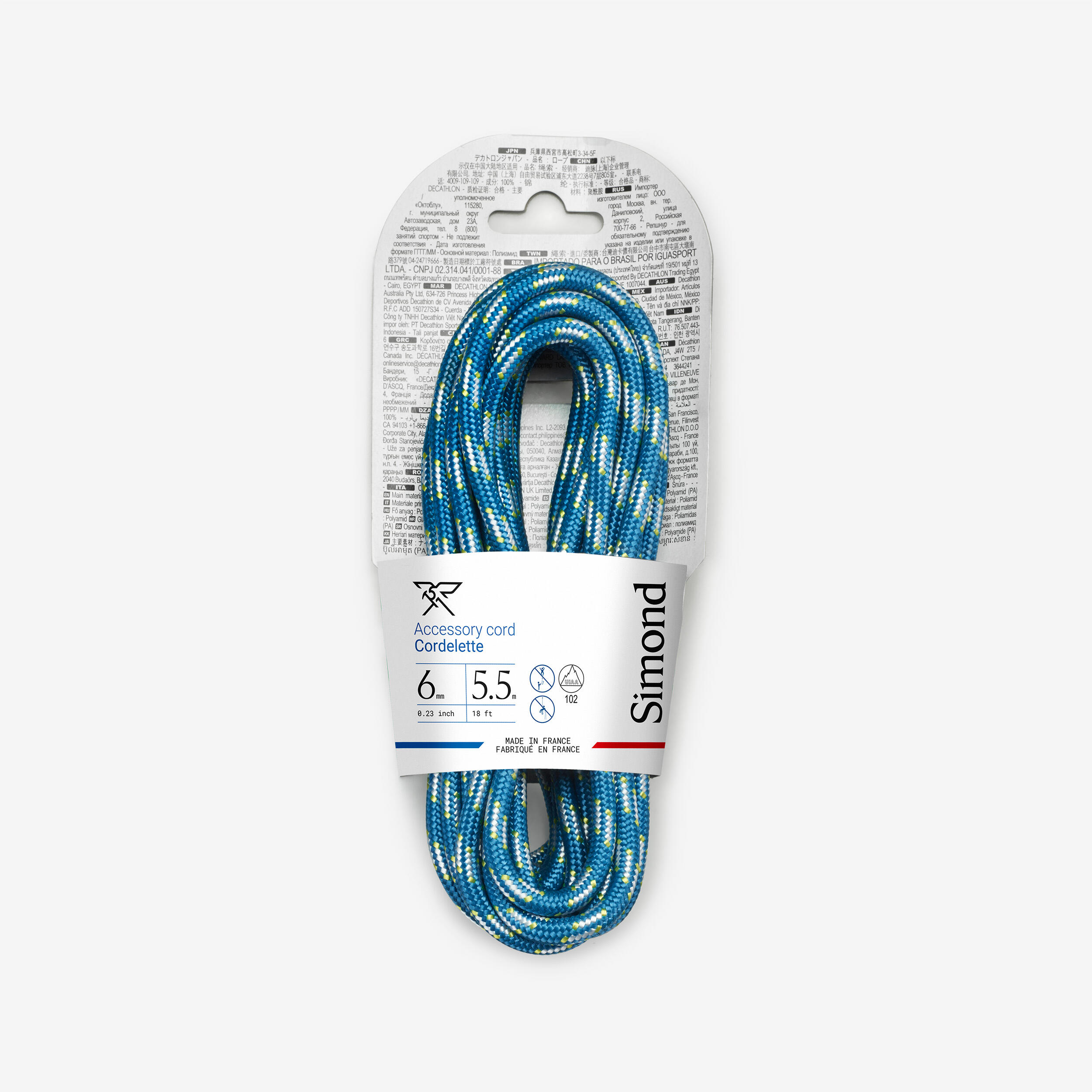 6 mm diameter semi-static cordelette for multiple backup uses in climbing, mountaineering, caving or working at height.
