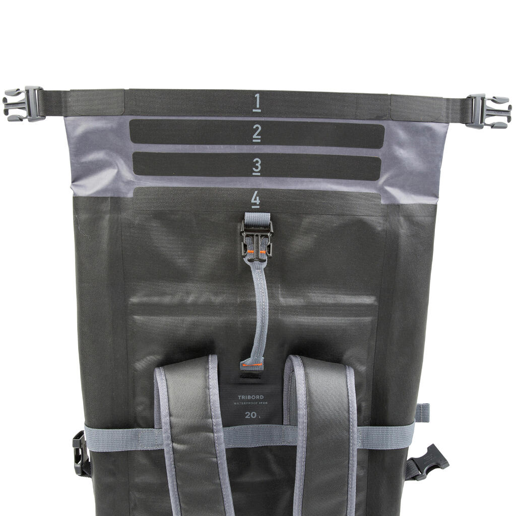 The 2 compression straps on the body of the bag can be used to attach the backpack to a SUP or a kayak equipped with fastening loops, enabling you to carry your belongings into the water and protect them.