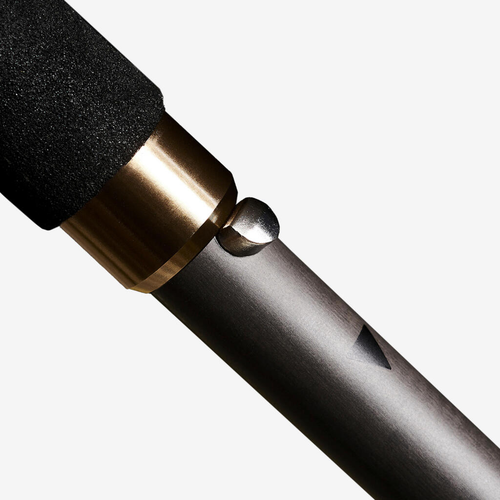 The tube construction is ultralight: 60% carbon fibre and 40% resin (to fix the fibres). The handle is composed of 100% EVA foam and the wrist strap of 100% polyester webbing. The tip made of tungsten carbide can the unscrewed and replaced.
