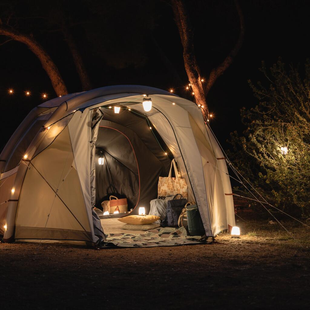Inflatable all-in-one structure with pre-assembled bedrooms and flysheet.