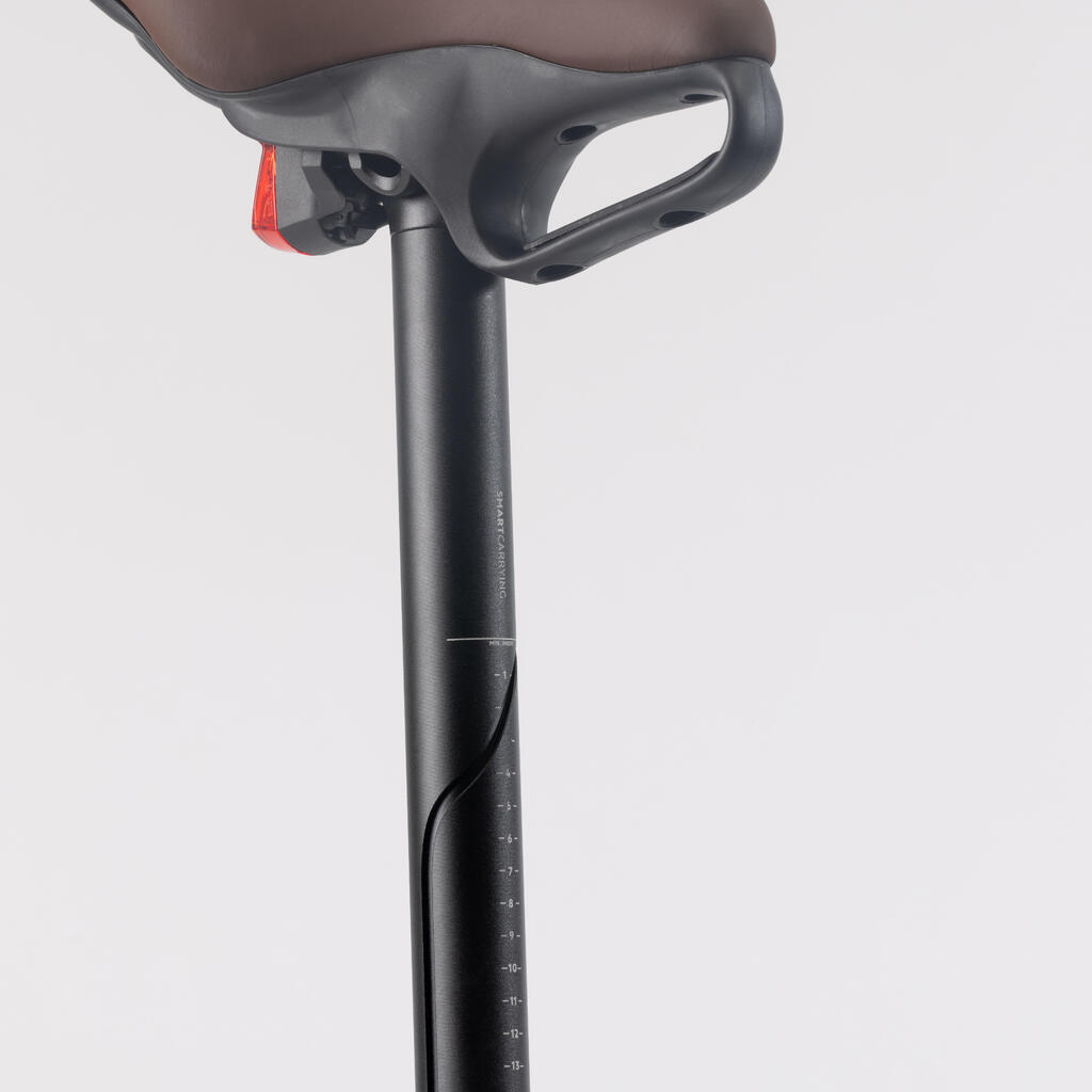 Leave the seatpost in its raised position and use one hand to steer it anywhere, even in busy pedestrian zones (e.g. stations and shops).