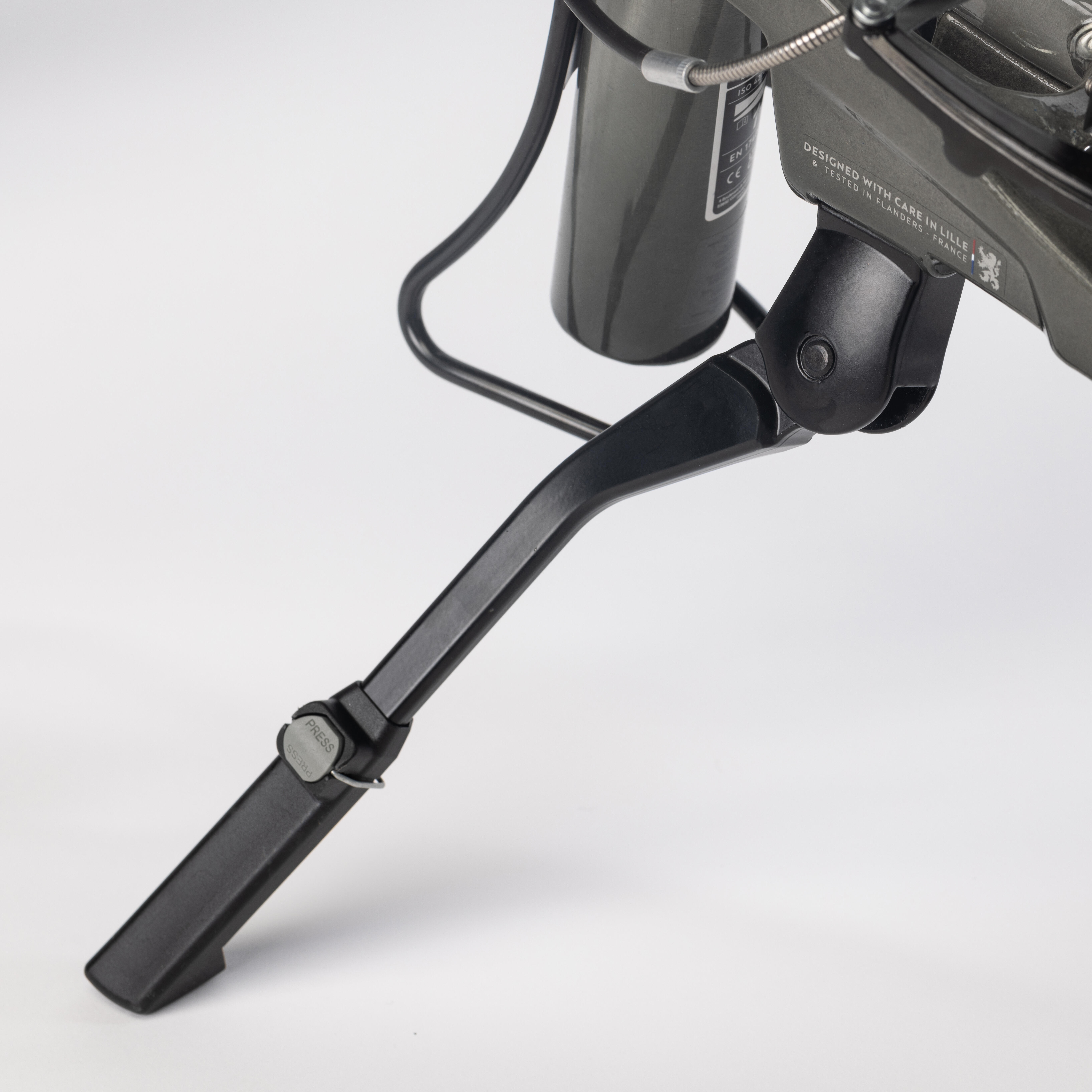 - Adjustable stand with a button to adjust the length. The stand keeps the bike stable when it's unfolded (whether or not you have bags on it).