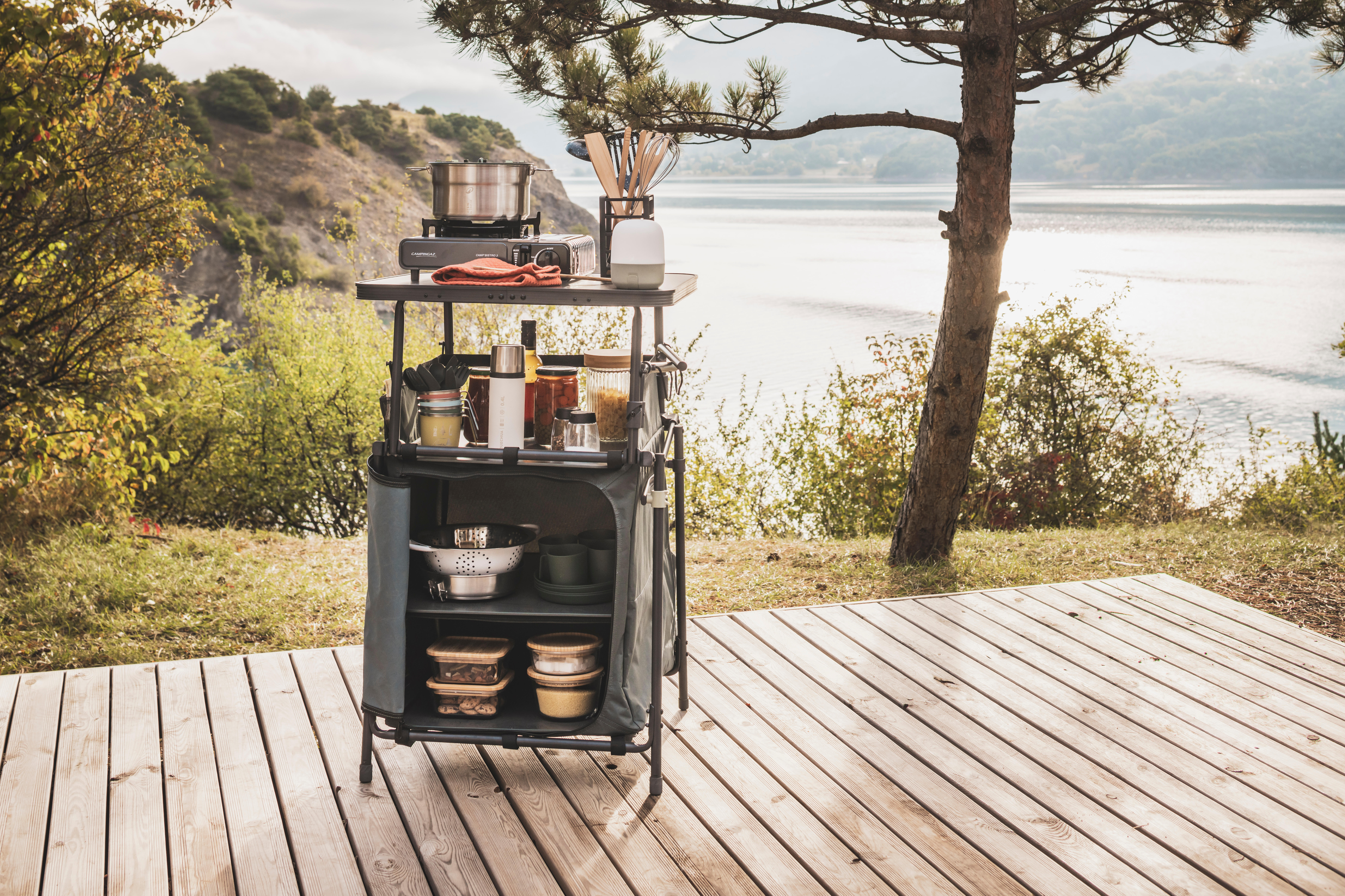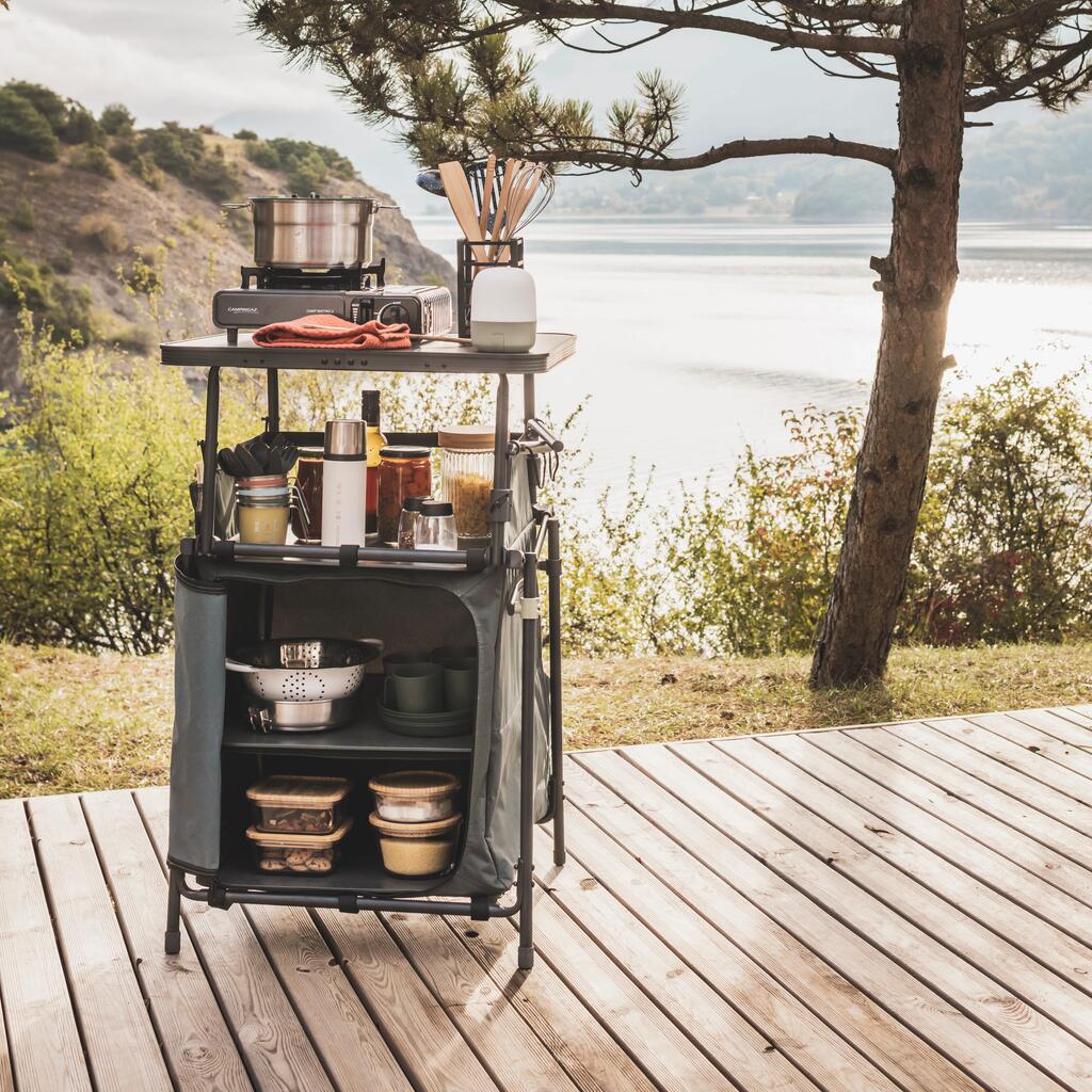 Our camper designers have designed this storage unit to organise and keep your stuff safe. It also lets you cook outdoors.