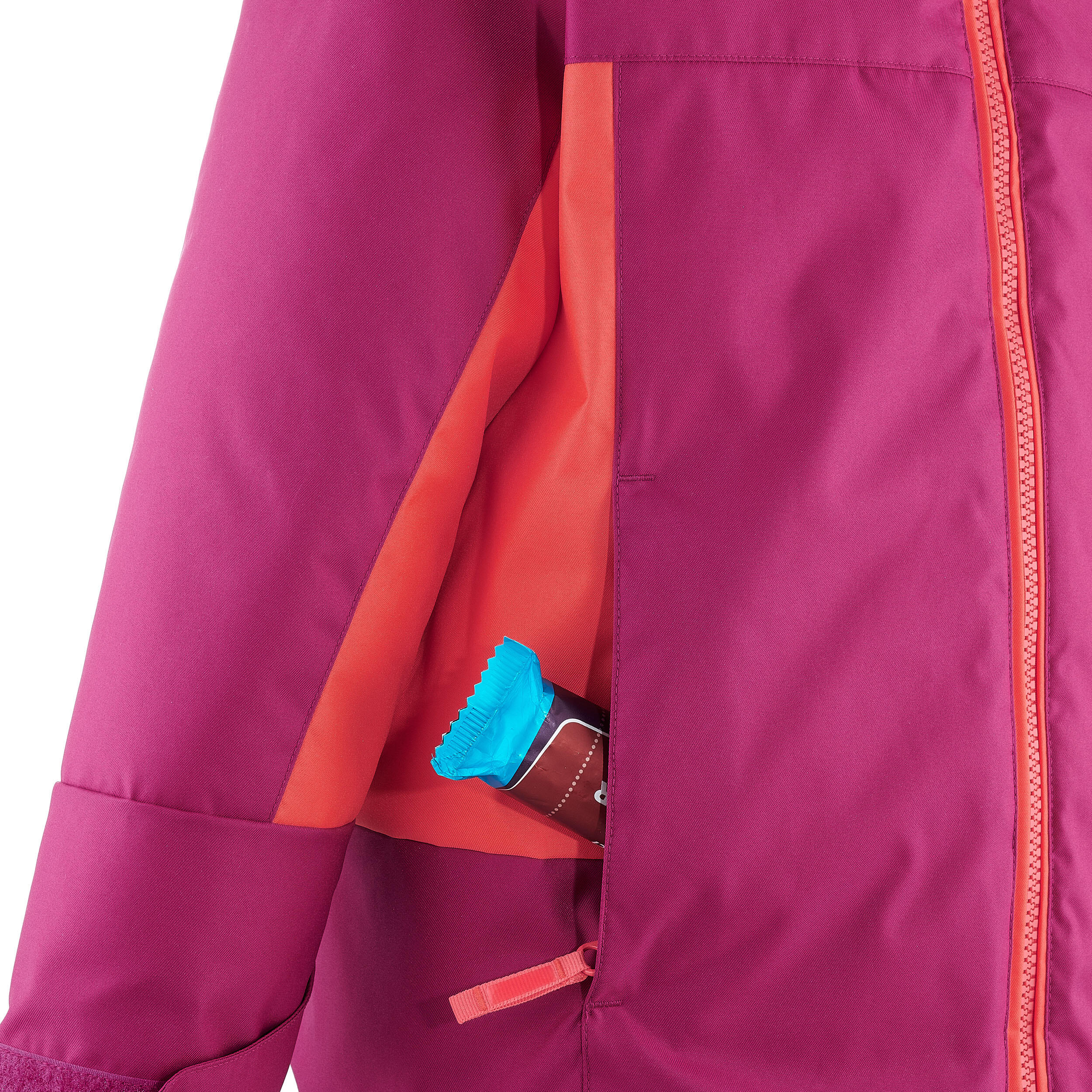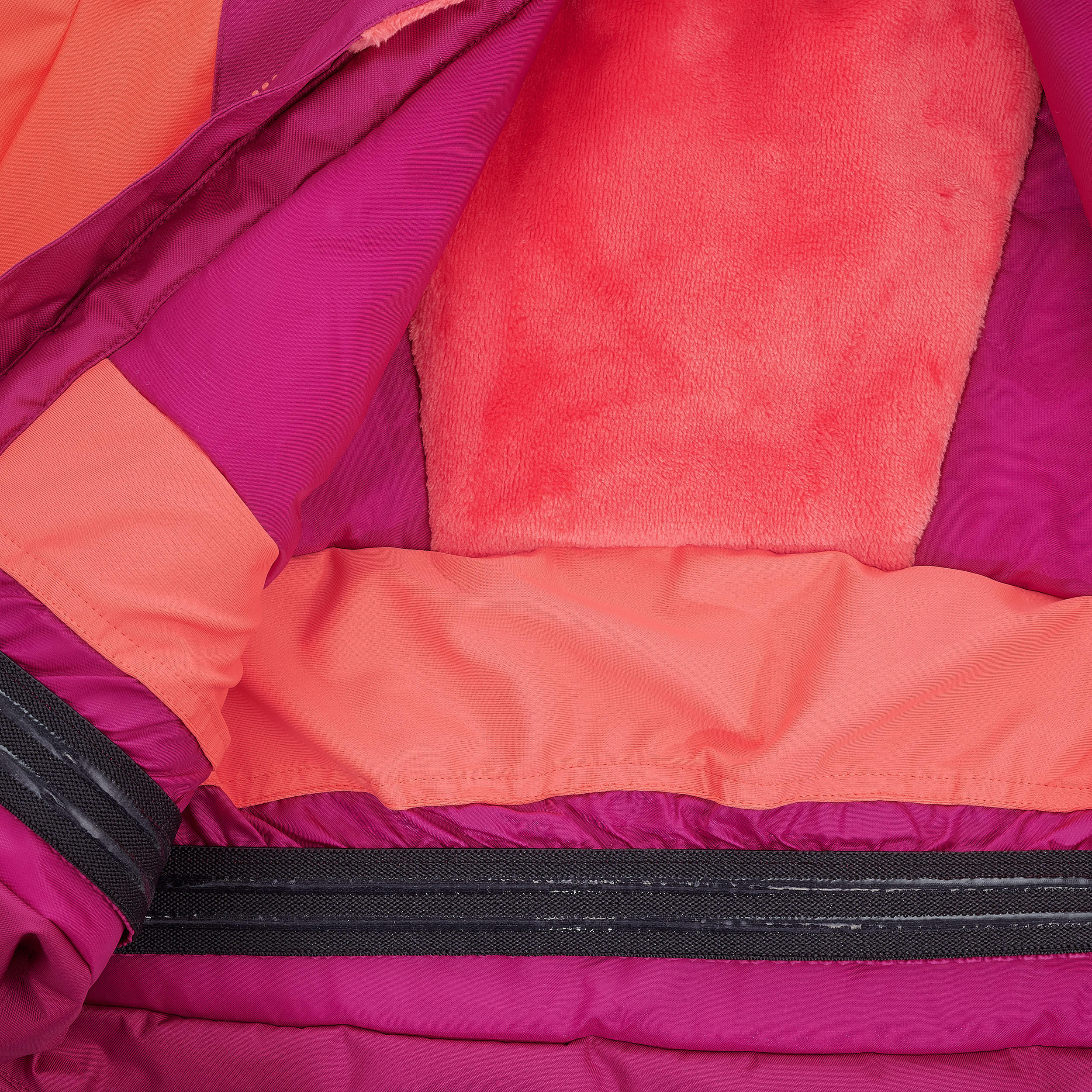 The snow skirt is a protective system located at waist level. On this jacket, it closes automatically when the child fastens their ski jacket. It prevents snow and draughts from entering when practicing winter sports, especially in the event of a fall.
