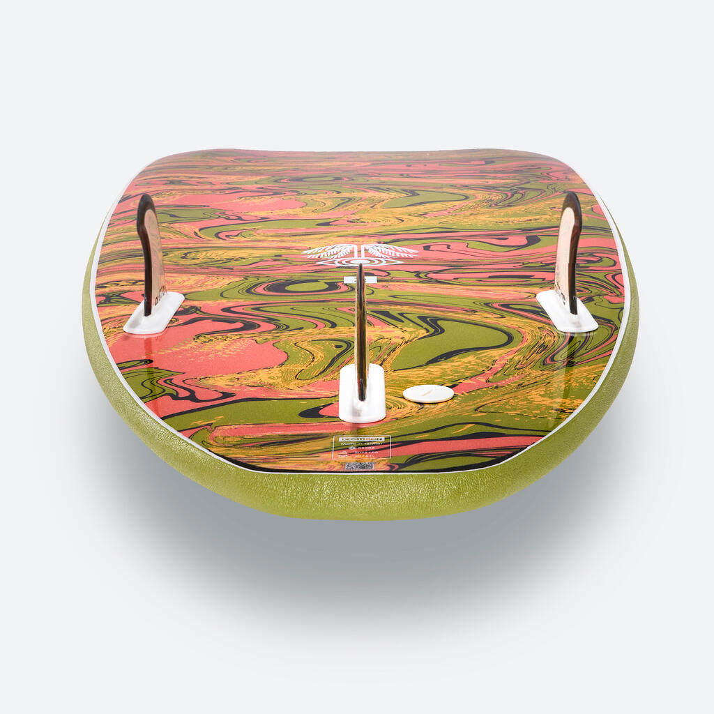 Expanded polystyrene core with 3 wood stringers. New Hot-laminated polyethylene coating on the core to limit water entry and improve the rigidity. High-density polyethylene bottom. Wax before use to avoid slipping.