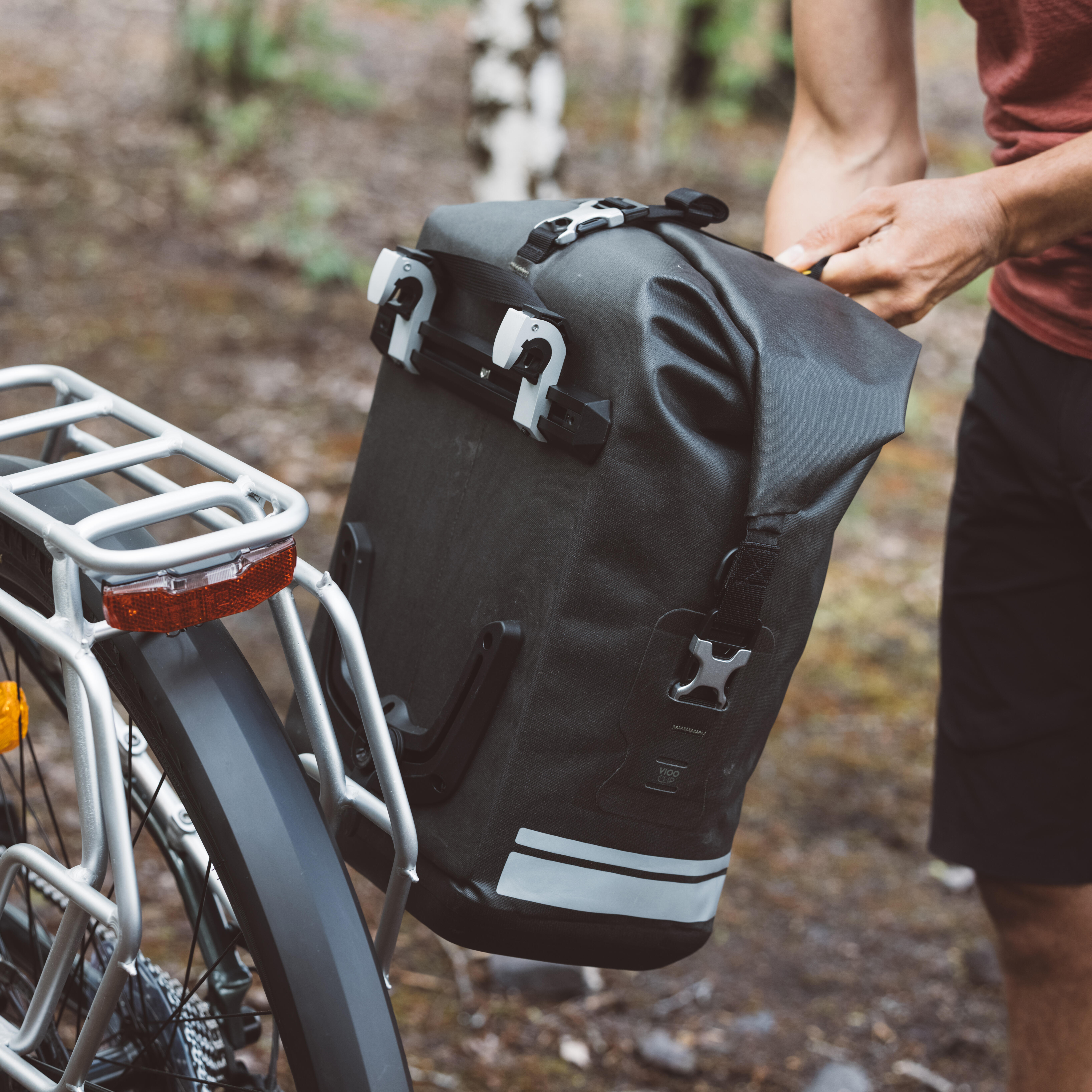 "One click" mounting system for clipping the bag to the pannier rack in just one motion.