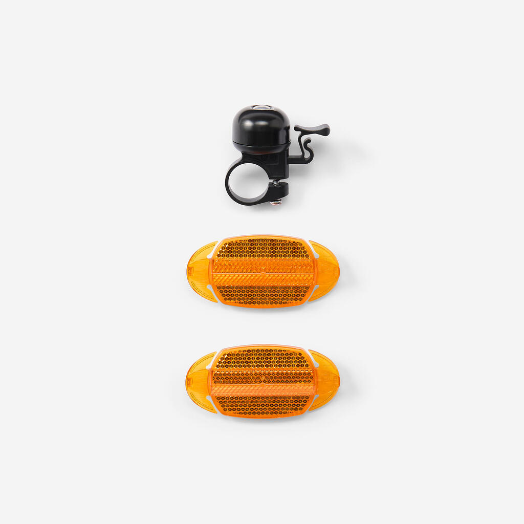 The bike is fully equipped for riding on public roads: battery-powered lights, bell, and reflectors on the wheels.