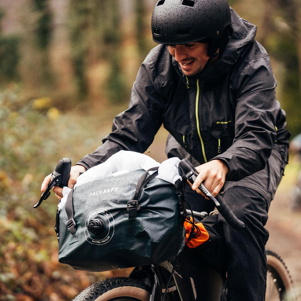 Connect the tube to the valve of the packraft as well as to the valve of the inflation bag. Open the bag fully to trap a maximum amount of air. Close the top of the bag and roll it to allow the air to pass into the raft. You can press it with your knees to help.