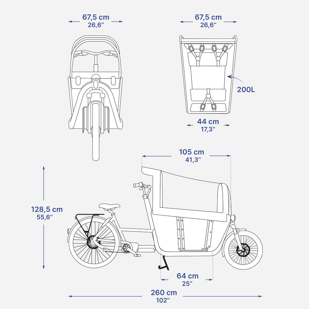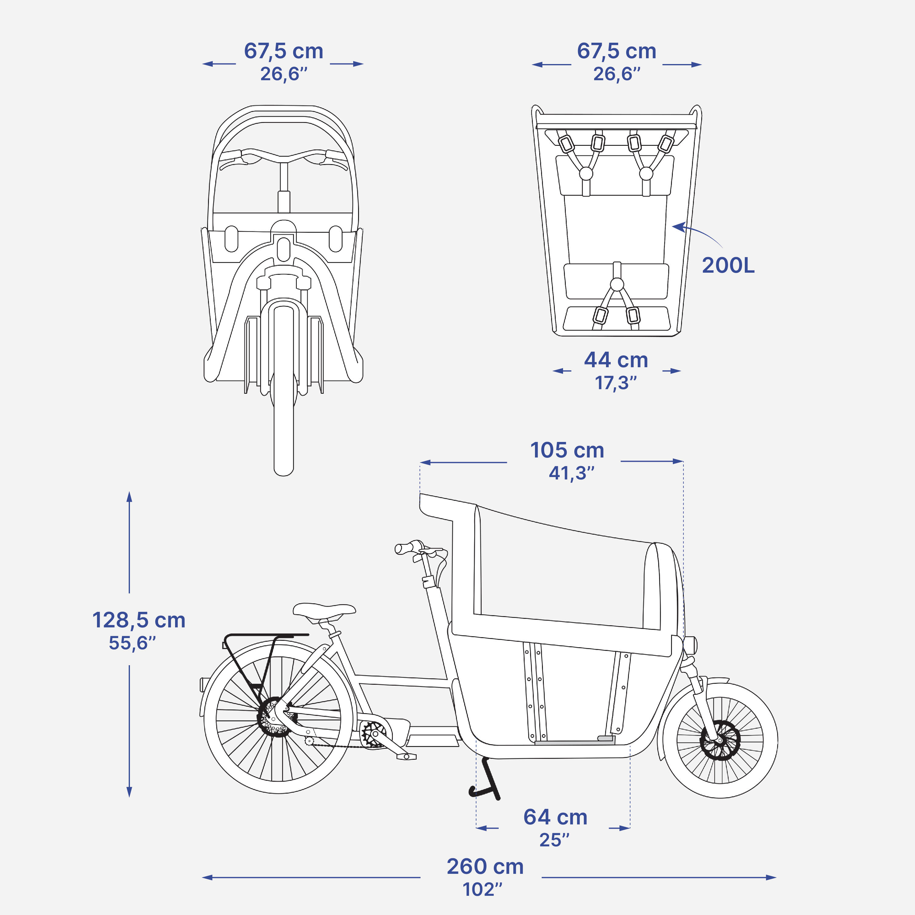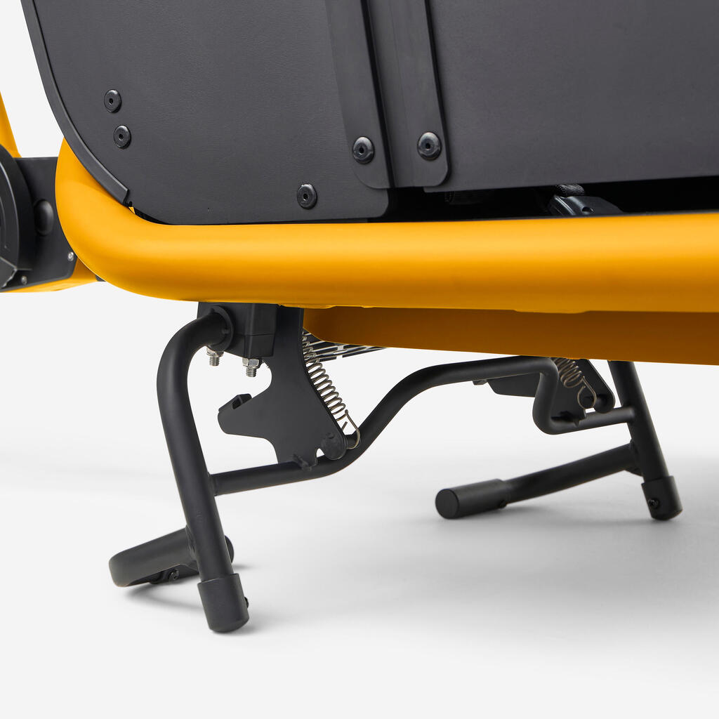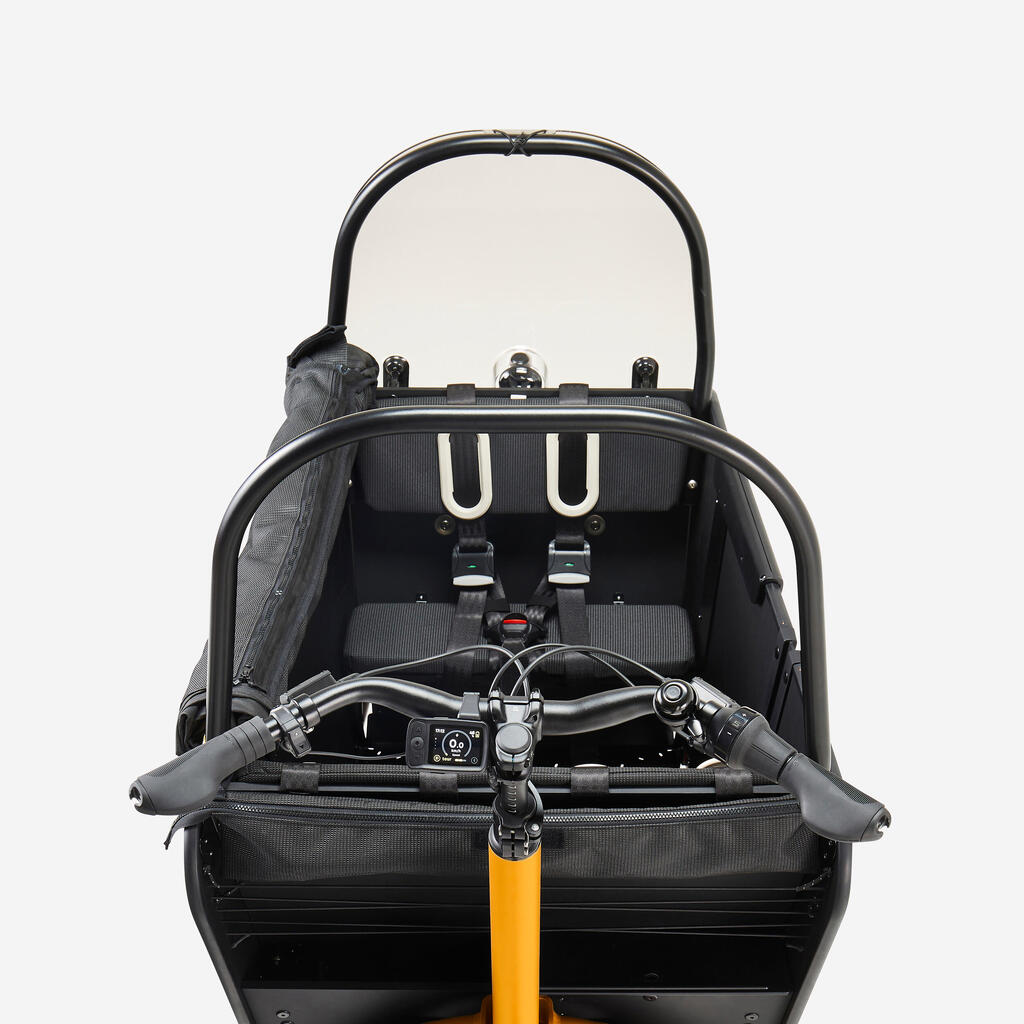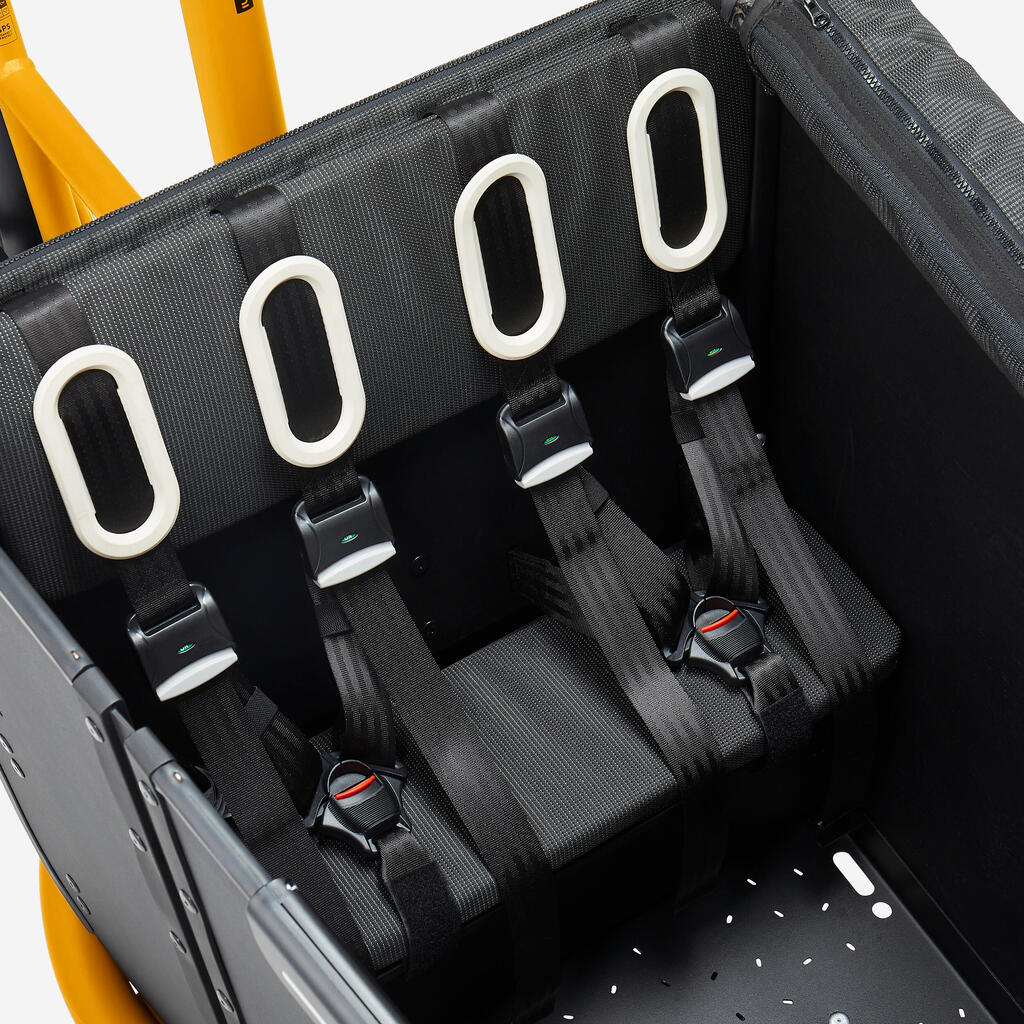 It provides very good stability when stopped, so that your kids can go in and out of the cargo bike carrier independently and safely.