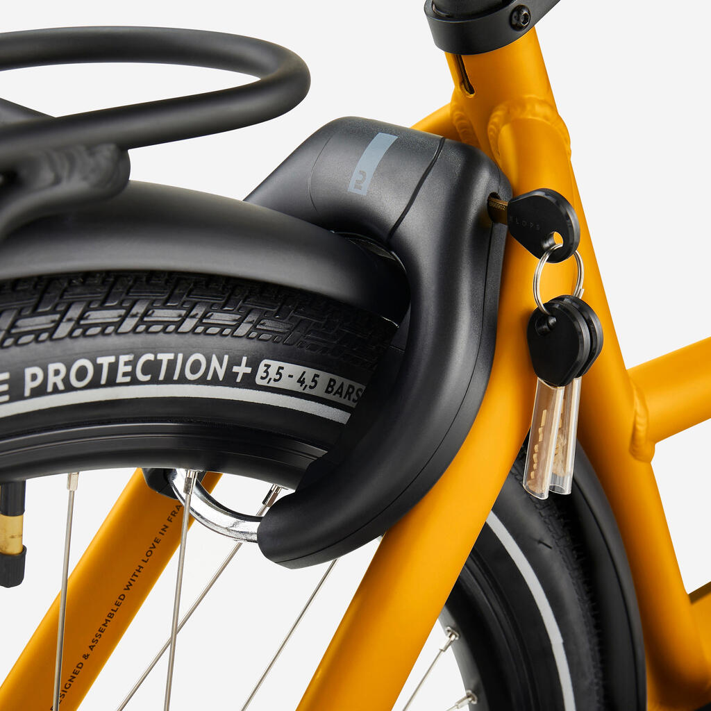 The bike is fitted with a fixed ringlock-type frame lock that locks the wheel.