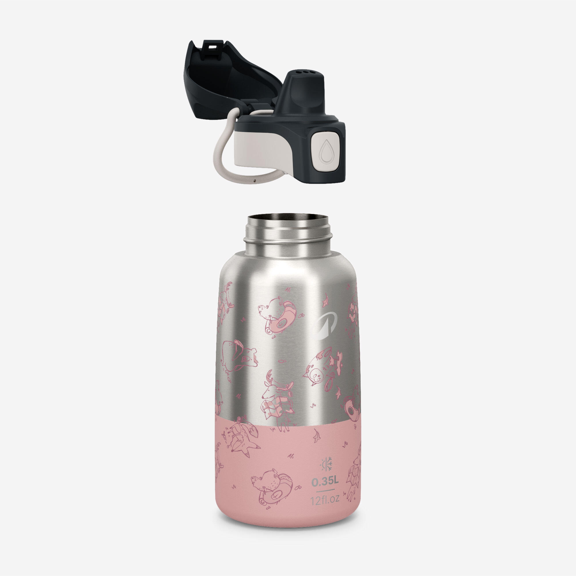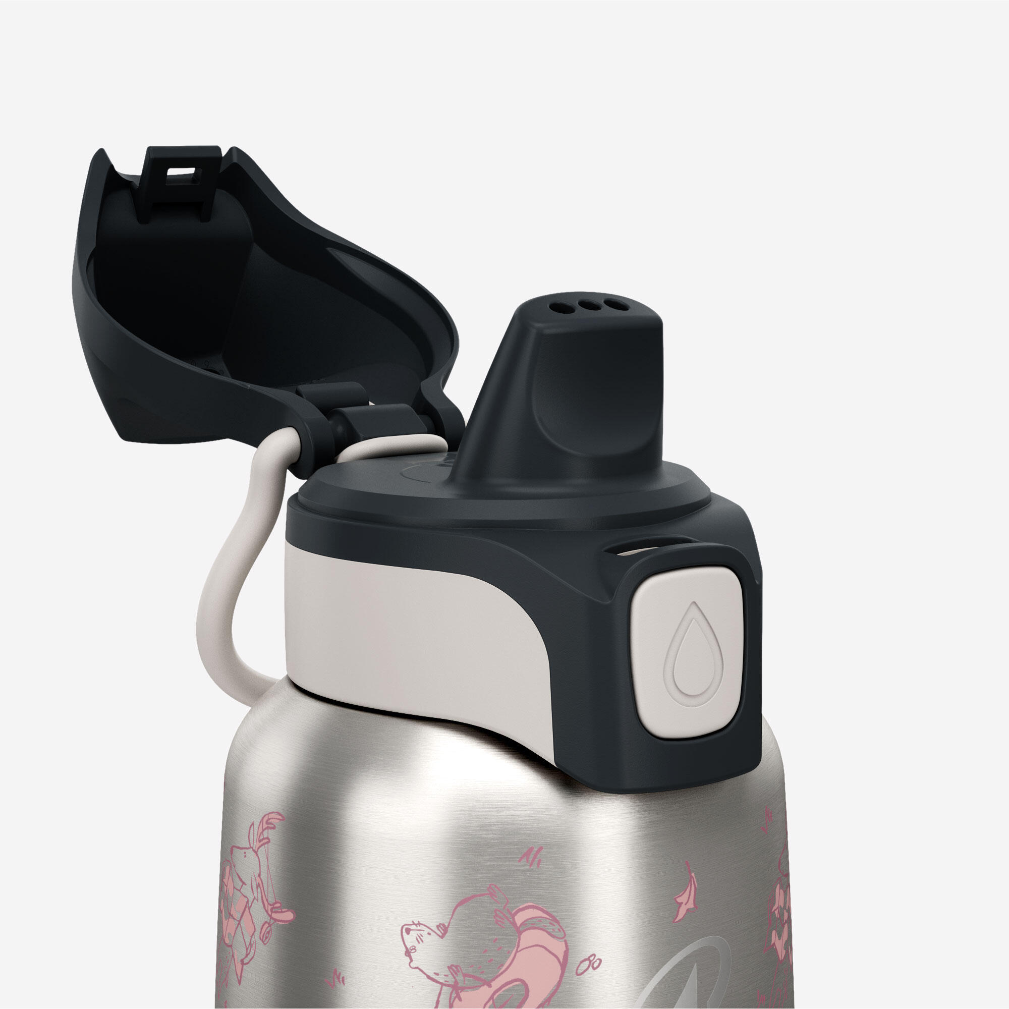 This flask has a cap specially designed for children. It has a transparent silicone valve inside to limit water flow for optimal use by children and also to stop the water flow when the bottle is not upright, ensuring it remains watertight, even with the cap open.
