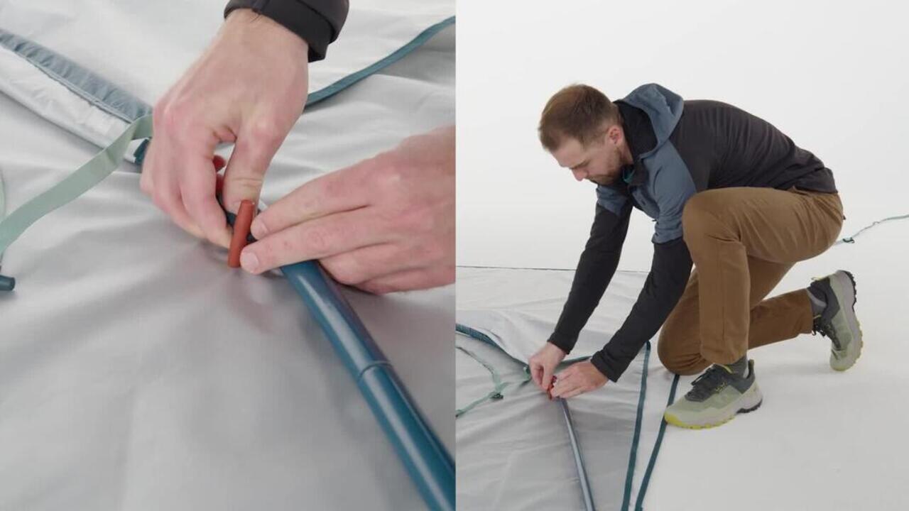 During assembly, it is important to always position the tarp of the awning on a pole of the tent (fibre tent pole or inflatable arch) for more stability and to avoid crushing the living room of your tent.