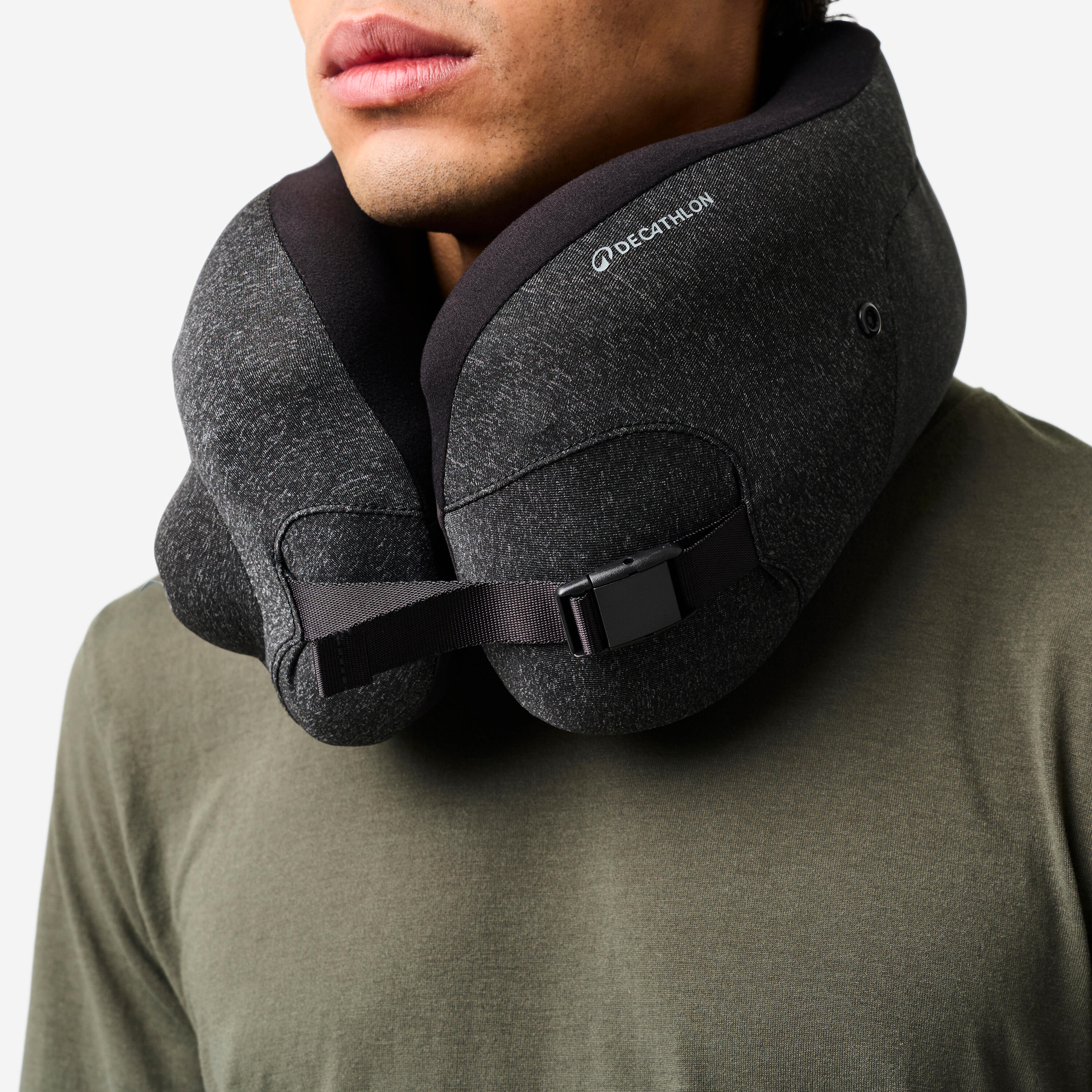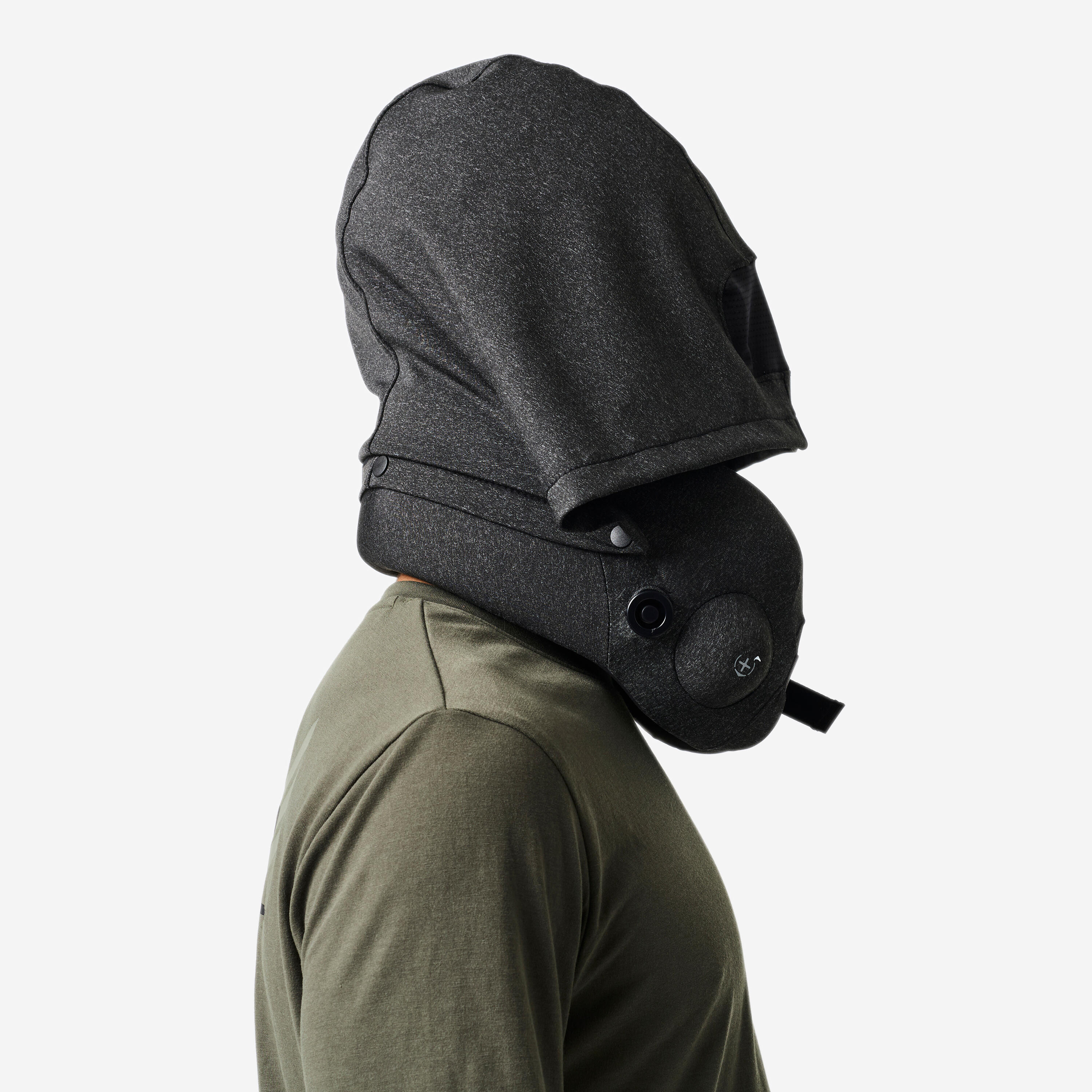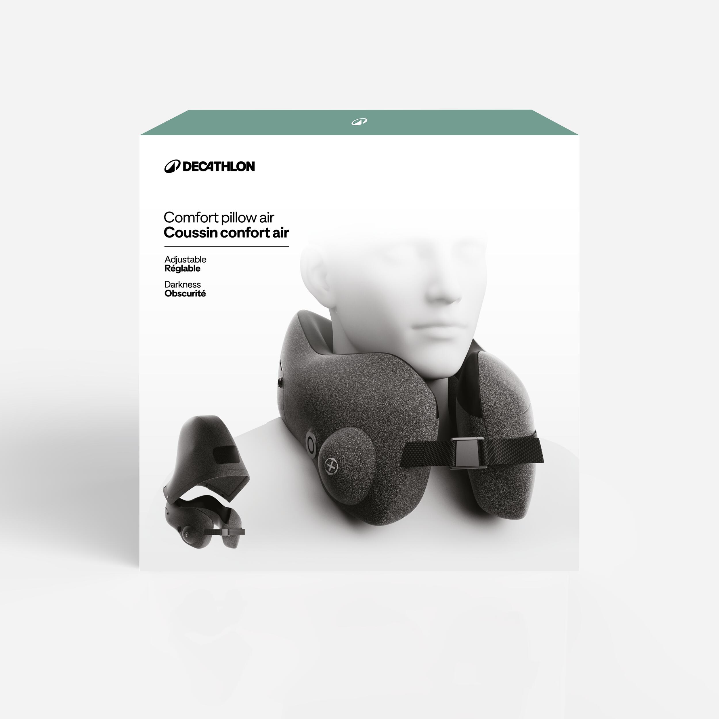 This inflatable neck pillow adapts to your needs and body shape:memory foam, adjustable height, and the option to be in darkness thanks to the hood.