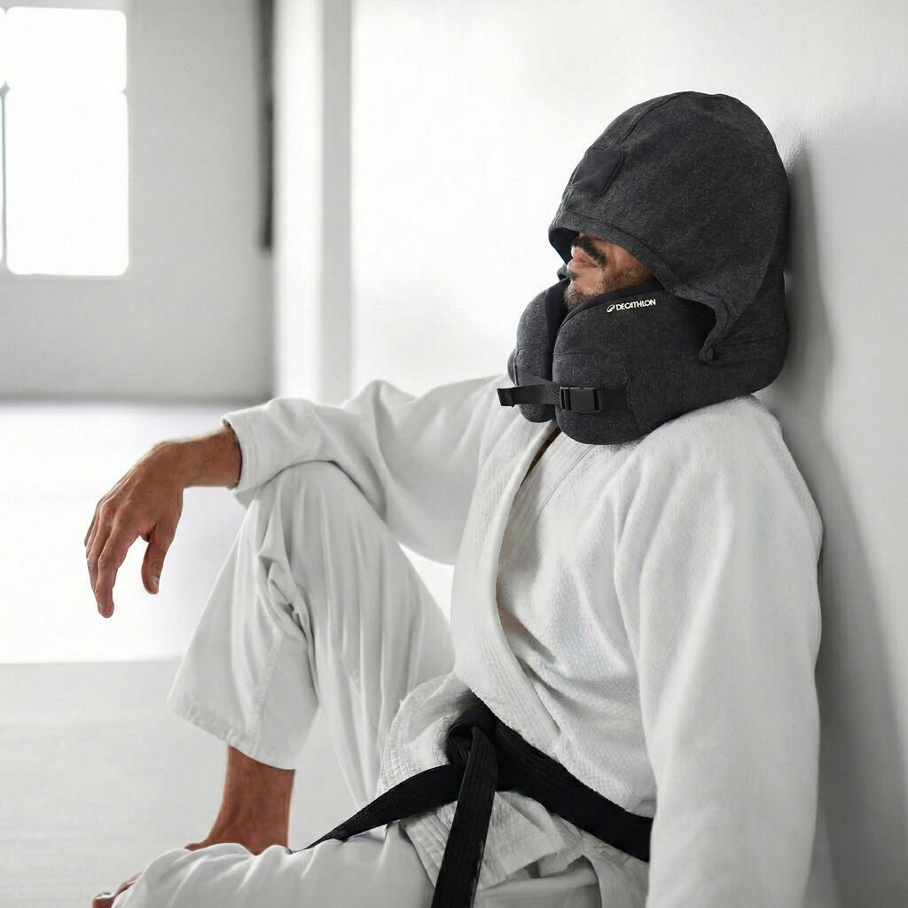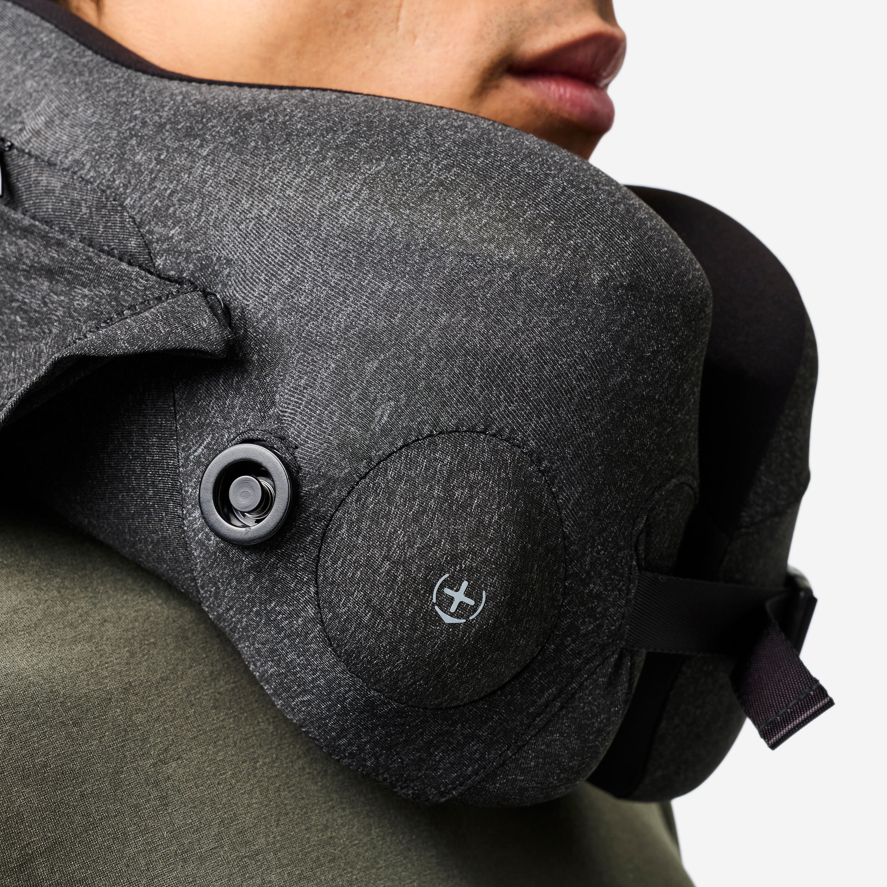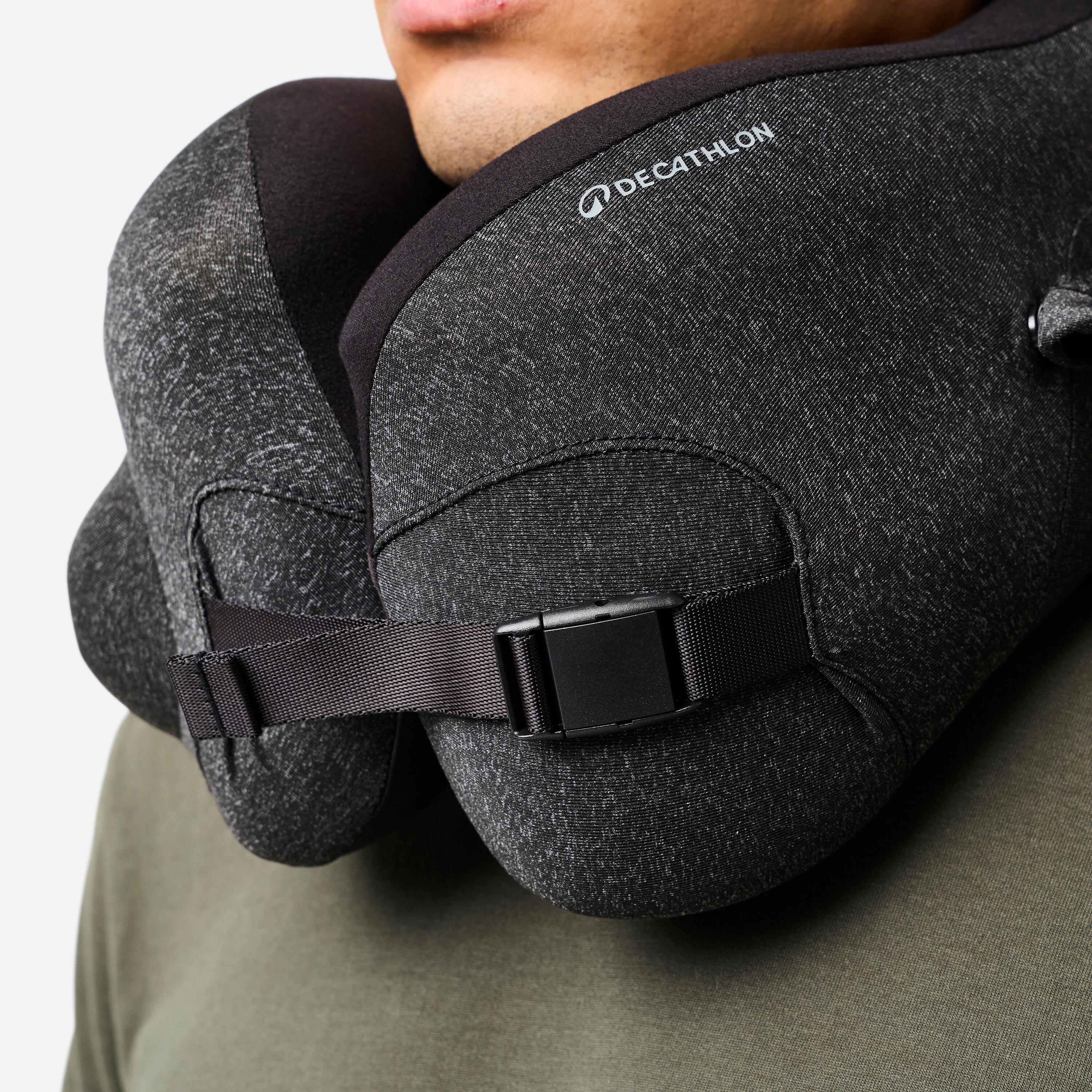 This inflatable neck pillow adapts to your needs and body shape:memory foam, adjustable height, and the option to be in darkness thanks to the hood.