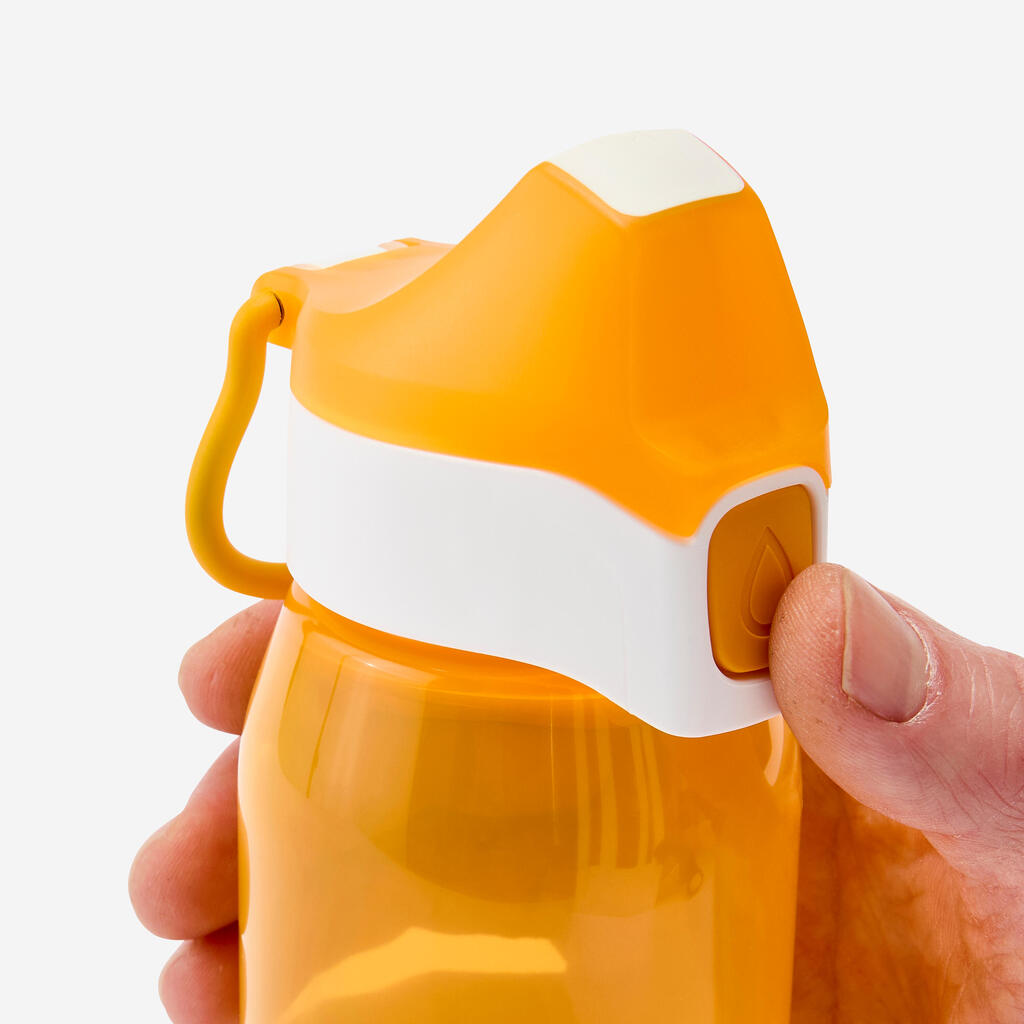 This bottle can hold 350 ml and is equipped with a cap designed by Decathlon to make drinking easier. Drinking from this bottle is just as natural as drinking from a glass. It's child's play!