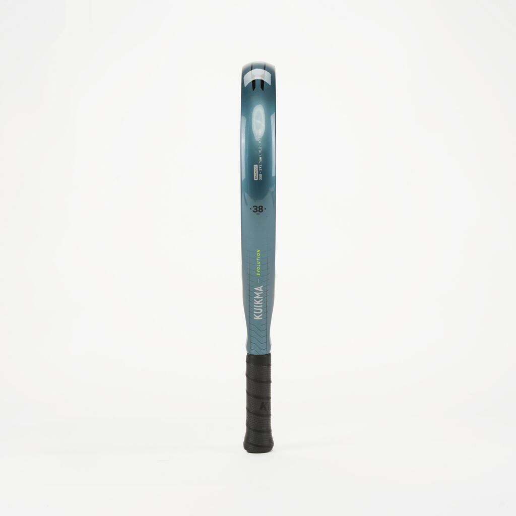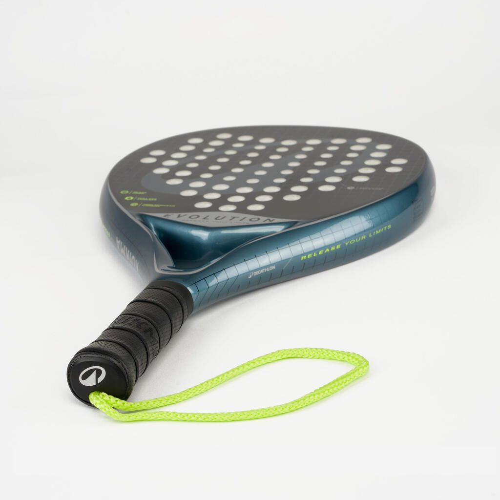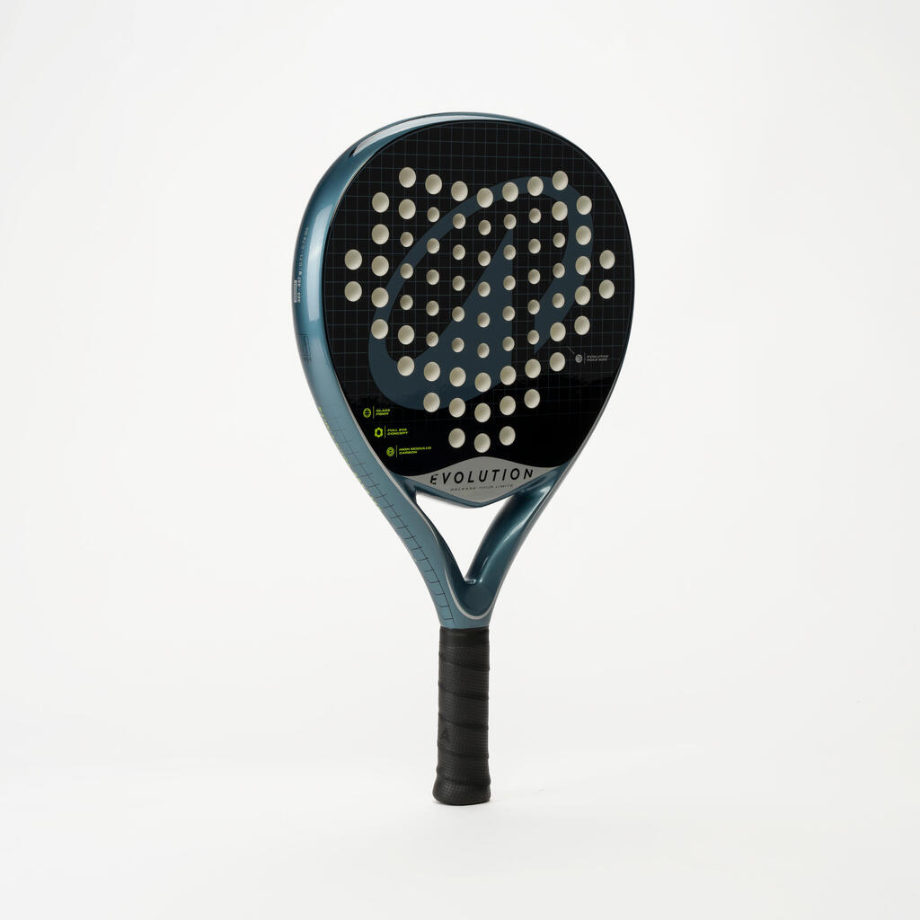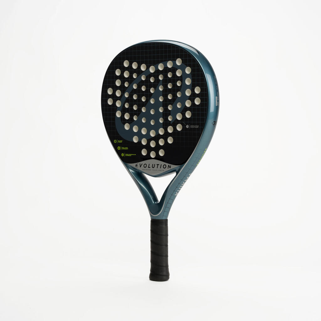 Made in a teardrop shape with a neutral balance (excellent balance of power and control). Lightweight (330 g).Fibreglass surface (comfort). Inner core with Full Eva Concept (forgiveness)