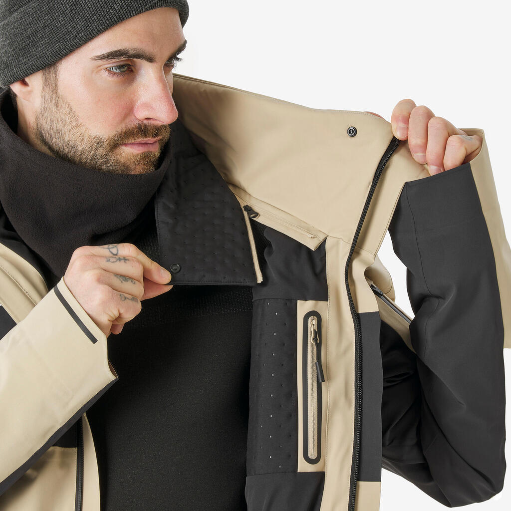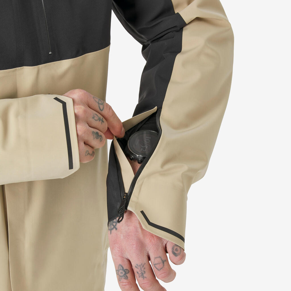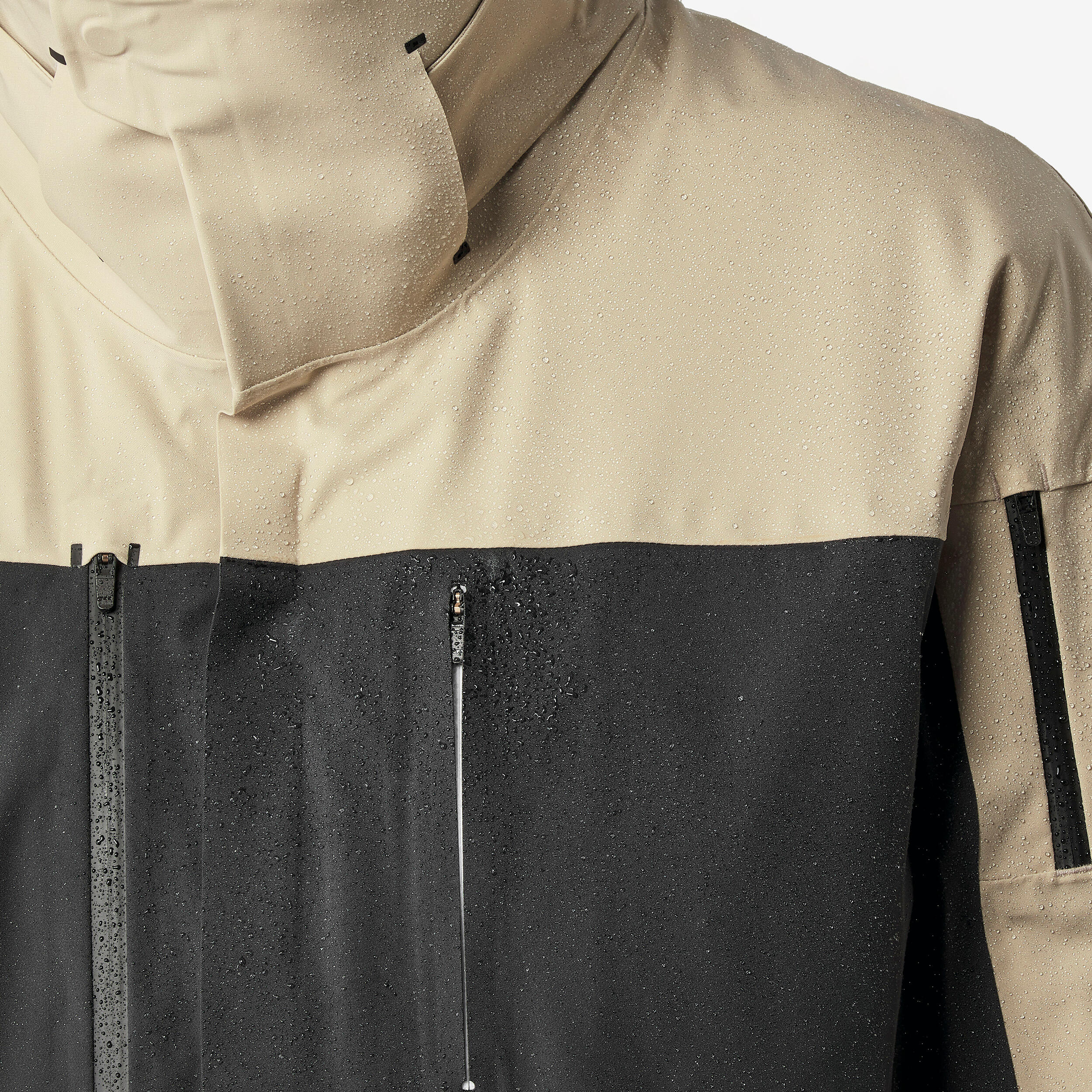 The waterproof component and the assembly prevent water getting in. The seams are waterproof, and the zips are also waterproof and under a protective flap. This jacket has been tested in a special shower that reproduces the conditions of the ski resorts, and in the field for several days in different weather conditions.